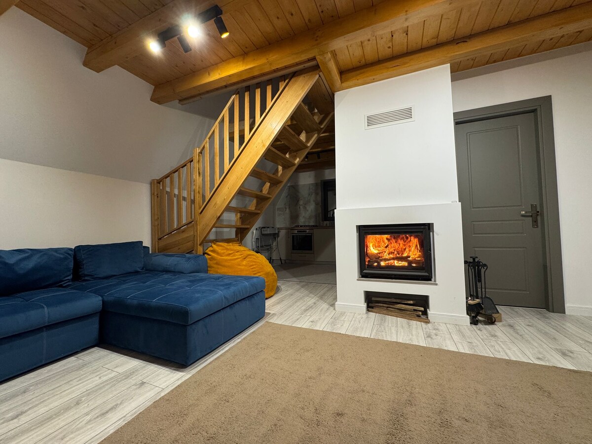 Isang frame cottage na may magandang tanawin, kaaya - ayang kapaligiran at ang lugar kung saan magagawa mong humanga sa pambihirang pagsikat ng araw. Mayroon kang 2 silid - tulugan , sala , kusina , 2 banyo , panlabas na patyo, pribadong paradahan, isang bote ng alak at kape mula sa amin .