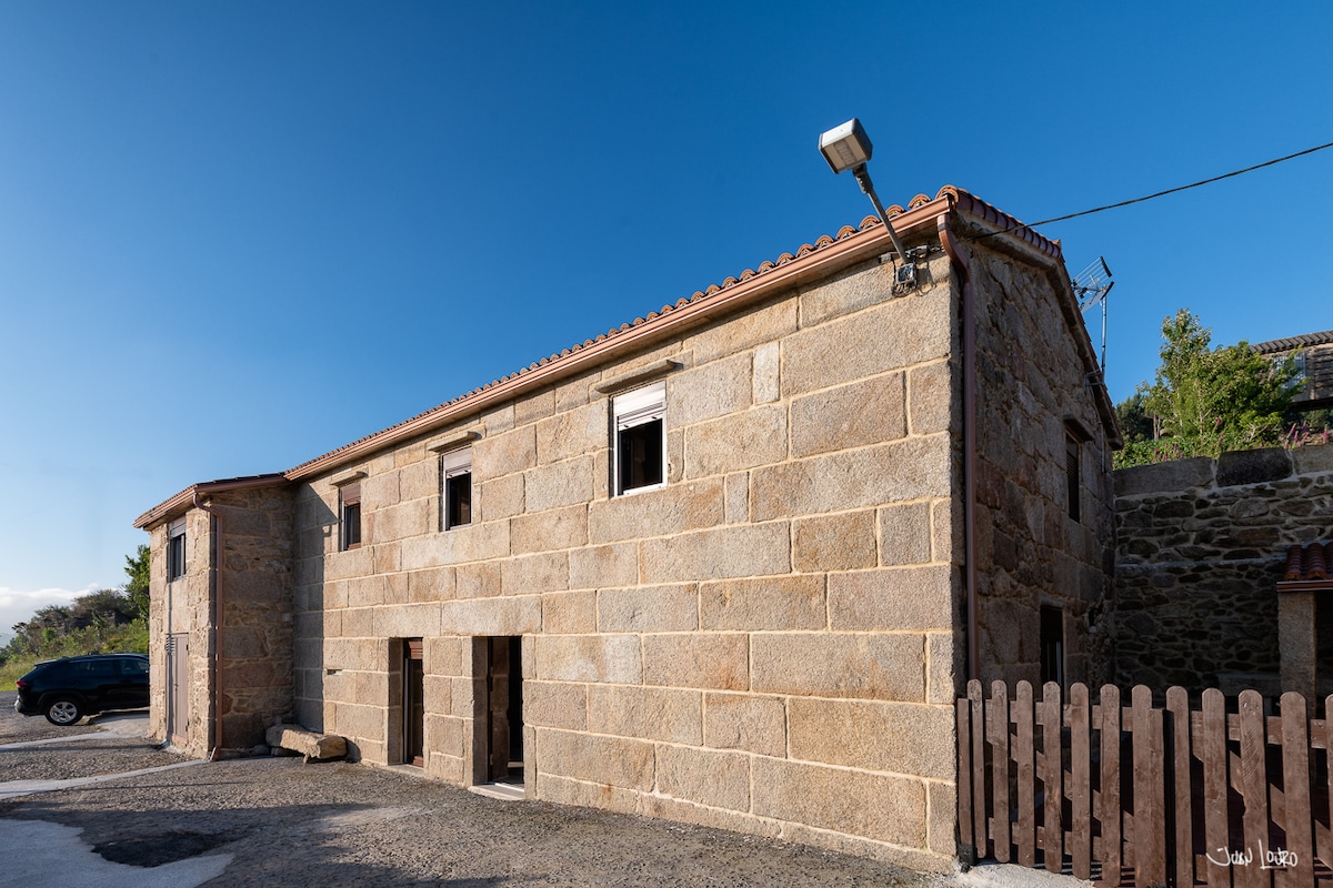 Refugio: arquitectura tradicional entre rutas de senderismo (A Moa ( Red Natura), Aguillóns, Camiño dos Costados), paseo enmarcado por muros de piedra rodeados de hórreos y al fondo la inmensa playa de Carnota, Boca do Rio y su marisma (a 10mn andando desde el refugio). Situado al abrigo del Monte Pindo, construido e 1920, pensado y restaurado 2021 como un espacio duradero donde el tiempo se detiene. Terraza abrigada del viento por muro de piedra a la sombra de higueras y laureles centenarios.