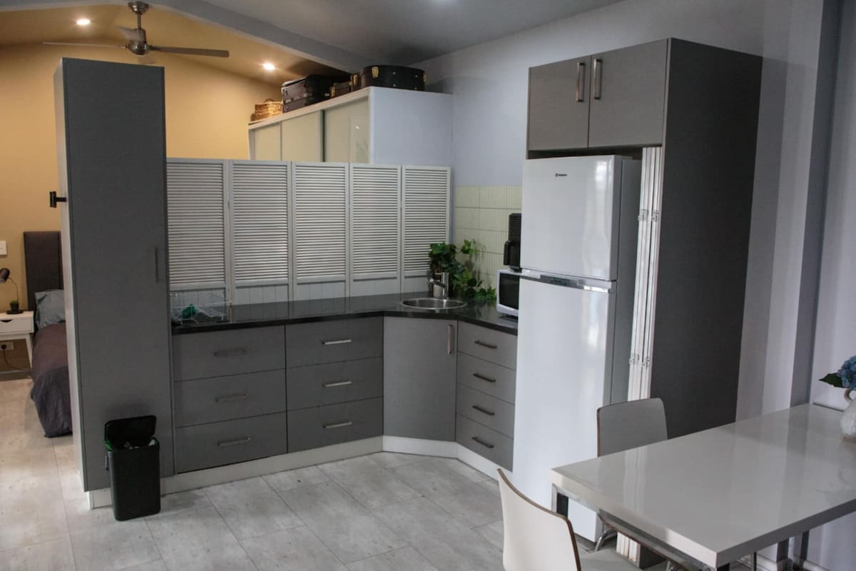 Napaka - pribado ng guest house na ito. Ito ay libreng nakatayo at may sariling ‘no stair’ side access. Maglakad nang diretso papasok. Angkop sa mga single, mag - asawa o batang pamilya. Maluwag ang lounge at dining area at ang kitchenette ay may lahat ng pangunahing kasangkapan para maghanda ng mga pagkain. Sa labas ay ang iyong sariling paglalaba, at magbahagi ng fireplace at swimming pool. 10 minutong biyahe ang layo ng Cronulla beach at 10 hanggang 15 minutong lakad lang ang layo ng Cronulla beach at Caringbah Shopping Center at Train Station.