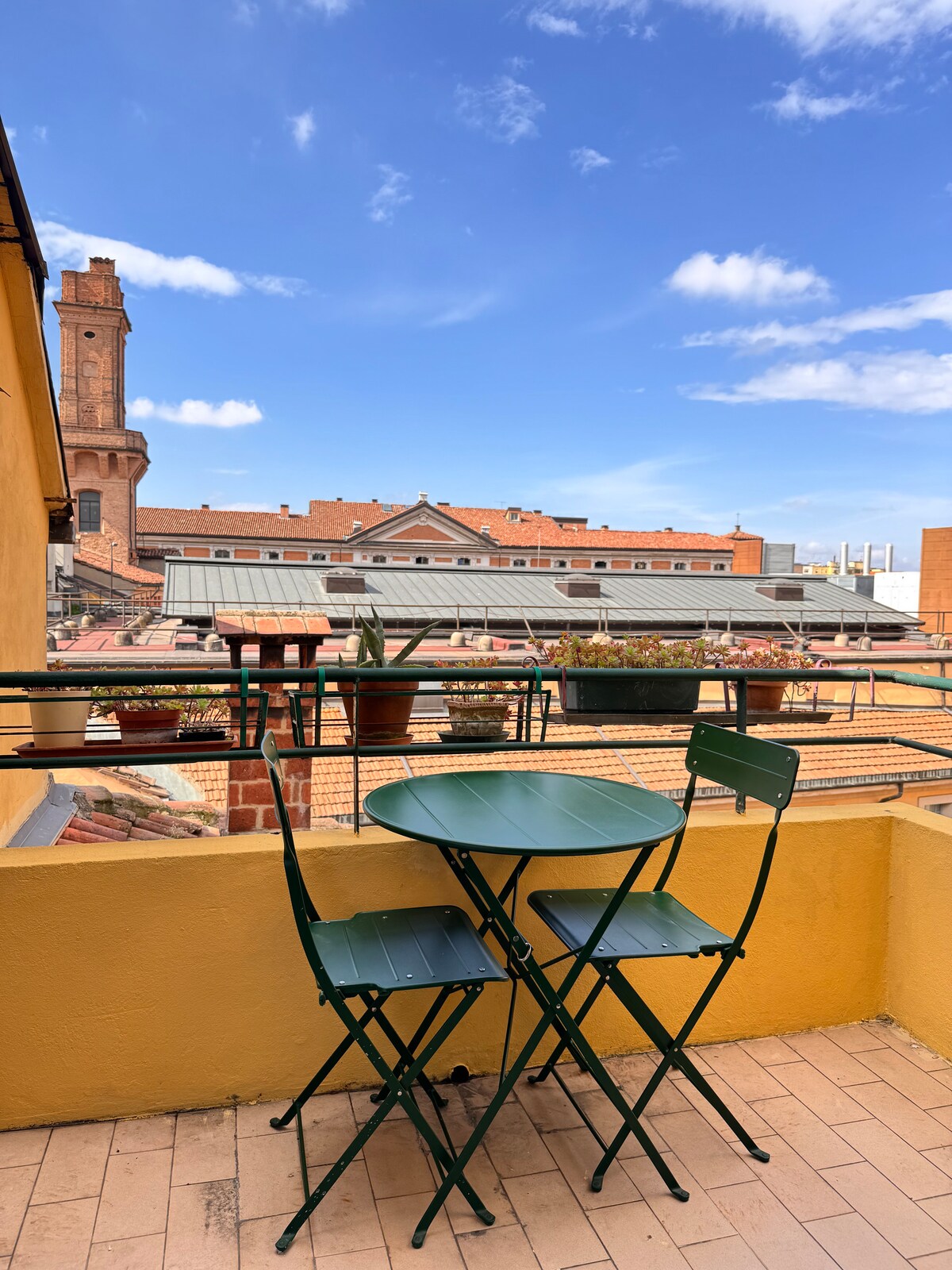 The apartment is situated on the top floor of an ancient building fitted with a glazed elevator in the heart of Medieval Bologna, right in front of the 17th-century Opera Theater. Cozy, panoramic and sunny, a quiet private loggia opens to the interior courtyards offering great views over rooftops, secular pine-trees, and the medieval Two Towers.