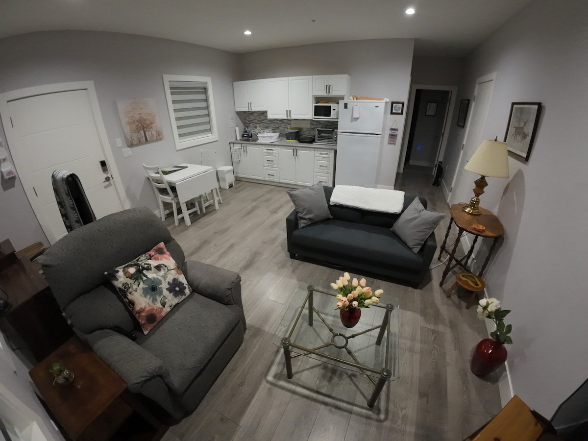 Ang komportable, modernong nasa itaas ng lupa na 1 silid - tulugan at 1 banyo na basement suite na ito ay maliwanag at maluwag at nag - aalok ng lahat ng kakailanganin mo para maging komportable hangga 't maaari ang iyong pamamalagi. 70 pulgada na TV w/ cable & Netflix, malaking sectional sofa na may double pull out bed, Wifi, central air, in - suite na labahan, mga de - kalidad na linen na may dagdag na kobre - kama. Maraming malalaking bintana na nagbibigay - daan sa maraming natural na liwanag at nakalaang lugar para sa trabaho kung saan matatanaw ang likod - bahay. Libreng paradahan. Pinapayagan sa labas ang pribadong patyo at paninigarilyo.