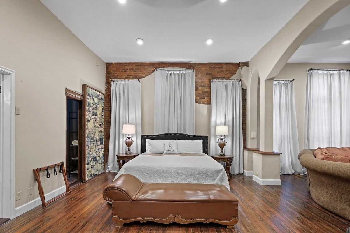 Mag - abang sa malinis na Bulwagang Lungsod kasama ang Statue of Liberty at isang bronze sculpture na nagmamarka sa lungsod kung saan bumisita ang Tapat na Abe bago ianunsyo ang kanyang run para sa Presidency. Ang orihinal na mga brick at hardwood sa natatanging % {bold taong gulang na bahay na ito ay nakatayo sa pagsubok ng oras. Sumakay ng elevator (o hagdan) papunta sa ika -2 palapag. Matatagpuan sa gitna ng makasaysayang downtown Leavenworth, ang Unang Lungsod ng Kansas. Sa loob ng ilang bloke ay may ilang coffee shop, panaderya, boutique, at bar. Matatagpuan lamang 10 milya mula sa award - winning na tourist town ng Weston, na may maraming mga serbeserya, gawaan ng alak, at hiking trail. Hindi mo ito mahahanap kahit saan pa! Orihinal na malalawak na matigas na sahig na inilatag 165 taon na ang nakalilipas at ang mga orihinal na brick wall na nakatayo sa pagsubok ng oras. Tanaw mula sa siyam na bintana na tinatanaw ang aming malinis na city hall na may rebulto ng kalayaan at rebulto ni Abraham Lincoln. (Inanunsyo ni Lincoln ang kanyang pagtakbo sa pagkapangulo doon mismo sa Leavenworth!) At sa tingin ko, malamang na naglakad siya sa kabila ng kalye at pumasok sa aming gusali dahil ito ay isang saloon noong panahong iyon! Papasok ka sa aming loft mula sa kalye sa pamamagitan ng keypad at mayroong isang maliit na silid na papunta sa aming bagong elevator (malaking bakal na pinto) upang dalhin ka sa ika -2 palapag. Nasa pader ang mga direksyon para sa elevator. Napakadali, palaging isara ang puting pinto ng accordian sa elevator kung sakaling tawagin ito ng iyong partido mula sa isa pang palapag. Ang iyong party lang ang mga taong may access sa elevator na ito. Ang pag - check in ay nasa pagitan ng 4 at 7pm. Paki - drop kami ng text kung wala ito sa takdang panahong iyon. 11am ang check out. Muli, paki - drop kami ng text kung kailangan mo ng mas maraming oras! Palaging isang text lang ang layo ng Mac at Stacy at puwede itong puntahan sa loob ng 10 minuto. # 913-651 -7798. I - text sa amin kung mayroon kang anumang tanong! Sumakay sa isang pasadyang elevator sa bukas at maaliwalas na lugar sa itaas ng kandila at boutique ng regalo ng host. Ang patag ay isang mahusay na base upang tuklasin ang KC, Fort Leavenworth, ang upuan ng county, at kakaibang Weston, MO. Ilang hakbang lang ang layo ng mga tindahan, restawran, coffeehouse, at bar. May malaking paradahan sa likod ng gusali sa ika -5 kalye. 65" tv, pero wala kaming cable. May dvd player, at puwede kang makipag - ugnayan sa iyong telepono sa tv para panoorin ang iyong pangunahing video, hulu, atbp. Iyon ang ginagawa namin, at ginagamit namin ang data mula sa aming telepono o computer para ipakita sa screen ng tv!