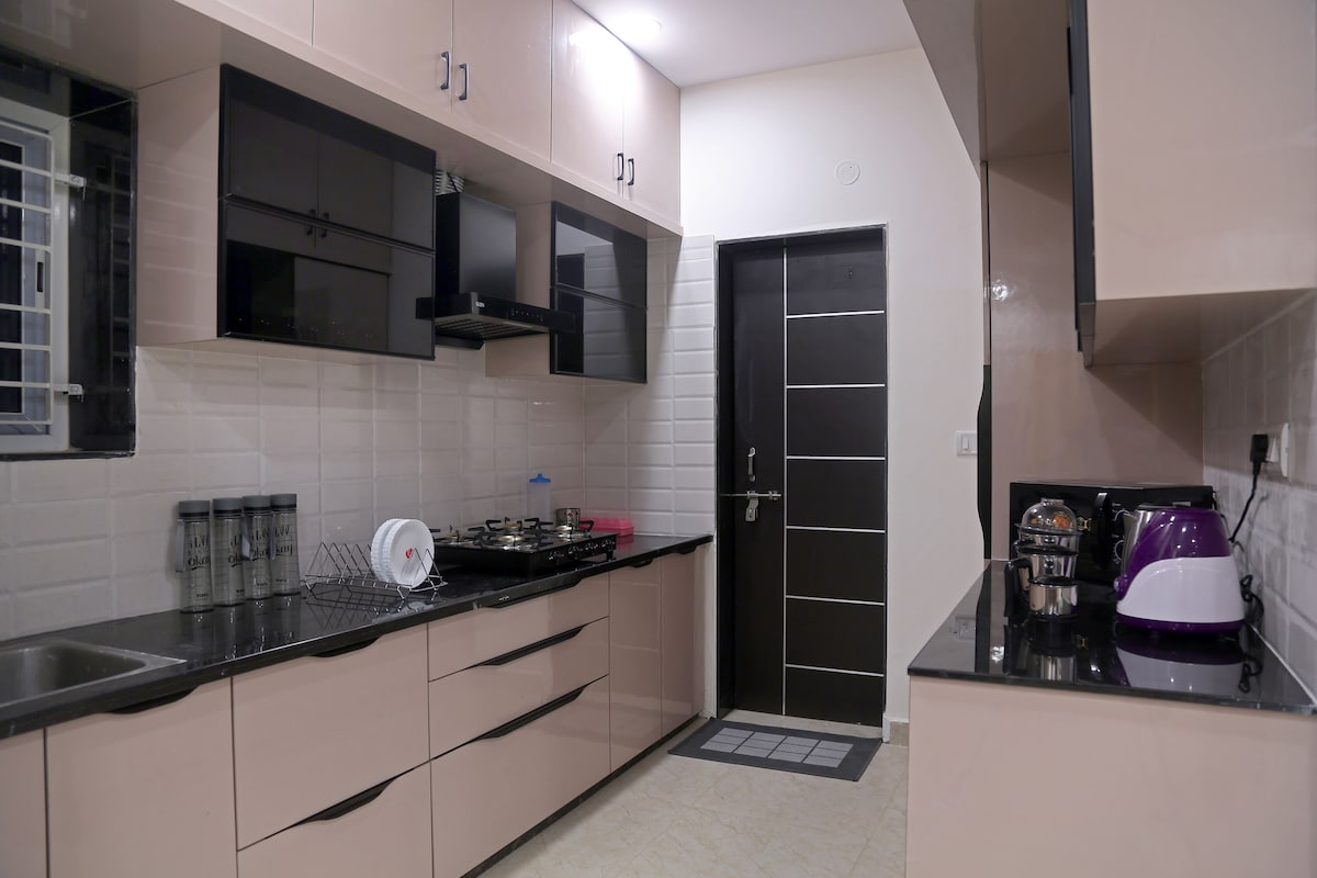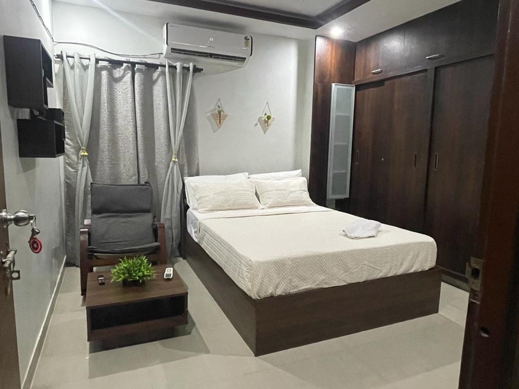 Magrelaks kasama ng Ehekutibo at mapayapang lugar na matutuluyan. Tinatanggap ka ng lugar na ito sa 2 bhk Flat na ito. Sa sandaling nasa loob, ang 4k TV at Sofa na nakatakda sa bulwagan ay ginagawang perpekto para sa Mga Pelikula at relaxation. Ang walang aberyang koneksyon sa WiFi ay perpekto para sa iyong trabaho. Mayroon kang Simple at kapaki - pakinabang na kusina sa iyong Kaliwa, Maluwang na Master bedroom na may king - size na Higaan at ang pangalawang Silid - tulugan ay may queen - size na higaan Parehong may mga nakakonektang Banyo na may air conditioning. May 1.5 toneladang AC ang parehong Kuwarto.