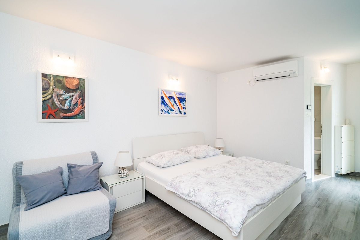 Ang apartment ay matatagpuan nang maayos, 15 minuto ang layo mula sa Old City, napapalibutan ng mga mabatong beach na wala pang sandaang metro ang layo, at ang pebble na isa sa paligid ng 200 m. Maliit na terrace sa anino ng Olive tree at Pergola, Flower garden, peacefull area ... Tungkol sa napakaliit na hiwalay na kuwarto, perpekto ang apartment para sa dalawang may sapat na gulang o pamilya na may dalawang bata o kabataan na hindi alintana ang pagtulog sa bunk bed .