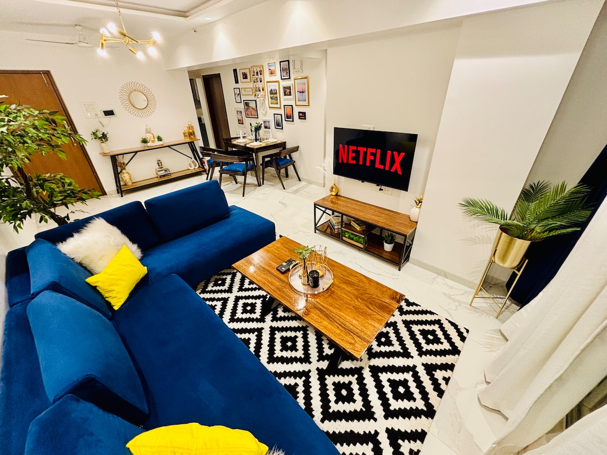 Elevate your stay in Mumbai with this stunning 2-bedroom apartment, designed for both relaxation and convenience. Featuring contemporary style & a cozy ambiance, this apartment will quickly become your favourite retreat from the bustling city. Whether you're here for work or leisure, you can enjoy a peaceful haven with easy access to the city’s key destinations. The apartment is: - 8 minutes to Domestic & International airport - 5 minutes to Jio World Centre - 5 minutes to Asian Heart Hospital