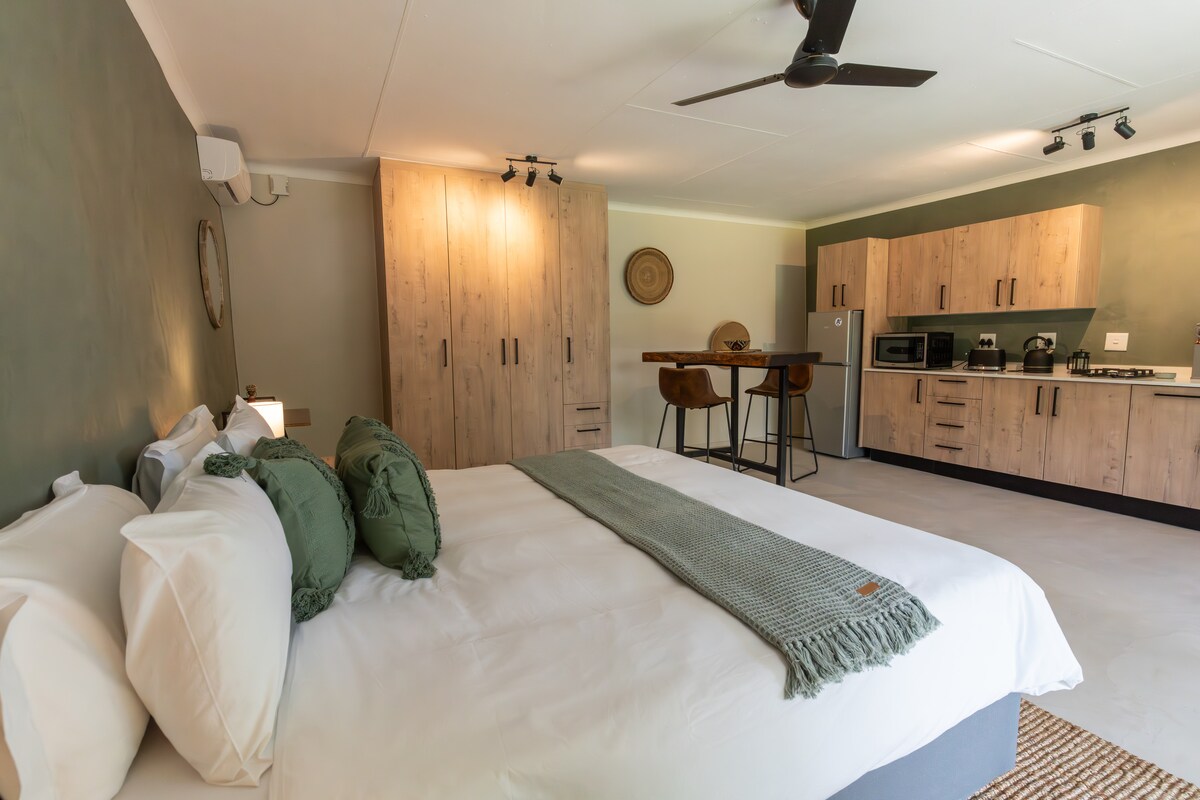 A spacious, private and quiet suite right on the Olifants River, in a secluded conservation estate. Self catering. Permanent hippos and crocs, leopard, hyena, galago. Lovely braai area under original riverine trees. Excellent birding, safe walks. Dirt road cycling paths. Minimal interaction from host. Light aircraft airstrip 500m from front door / Professional Guide for walks or Selected Spa treatments all available with prior arrangement at additional cost.