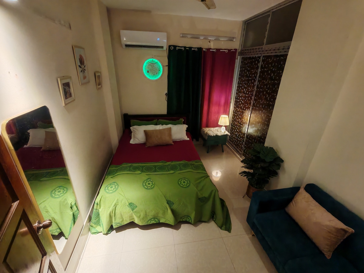 Pinagsasama ng komportable at maginhawang tuluyan na ito sa ika-4 na palapag ang maliwanag na kuwarto, kabinet sa pader, lugar na may upuan at TV, silid-panalangin, workstation, at lugar na kainan. May refrigerator, oven, at HI‑TECH na water filter sa kusina para sa mas madaliang pamumuhay. May mga pangunahing kagamitan tulad ng geyser, Wi‑Fi, at AC sa kuwarto at sala para masigurong komportable ang pamamalagi. Katabi ito ng Gulshan Aarong outlet at malapit sa mga tindahan ng pagkain, kaya perpekto ito para sa tahimik na pagbabasa, pagtatrabaho mula sa bahay, o pagrerelaks para sa hanggang 2 tao.