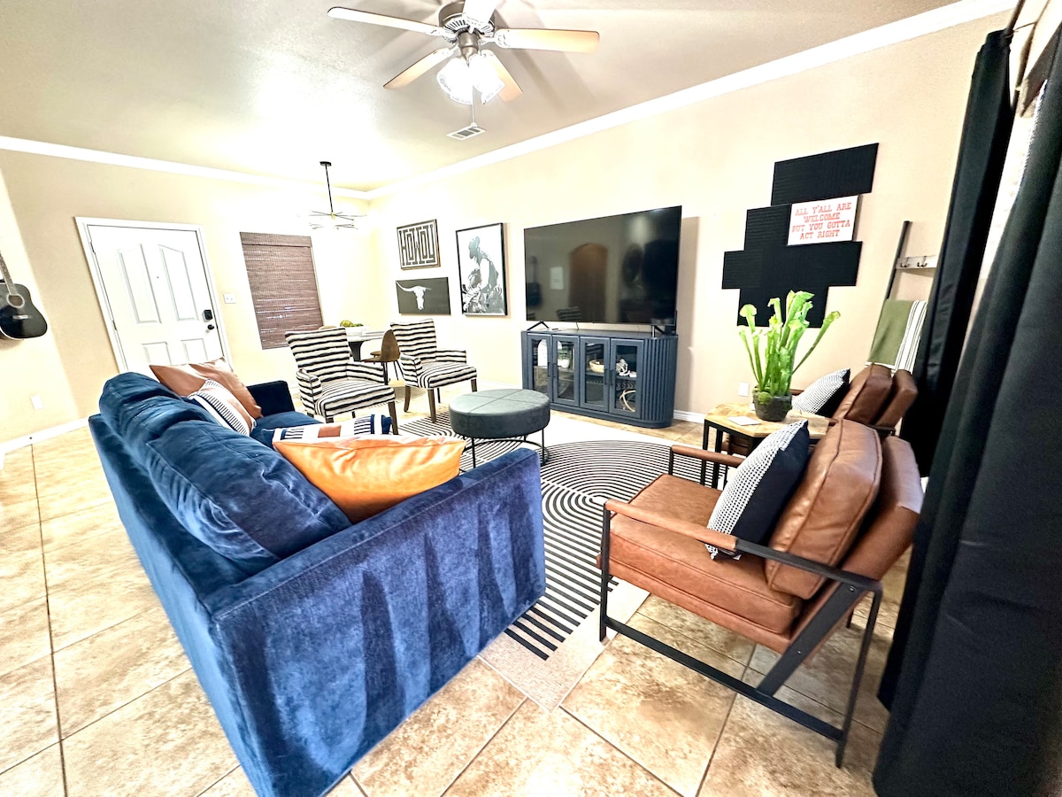 Nag - aalok ang naka - istilong natapos na tuluyang ito ng tahimik at nakakarelaks na karanasan sa bakasyunan sa pinakamagandang tradisyon ng hospitalidad sa West Texas. Puwedeng kumportableng matulog ang tuluyan ng 6 na may sapat na gulang at isa pang dagdag kung gagawing higaan ang couch sa sala. Mayroon itong 75 pulgadang smart TV sa sala at 65 pulgada sa master bedroom. Maraming amenidad na kailangan para sa maximum na kaginhawaan ang naroroon.