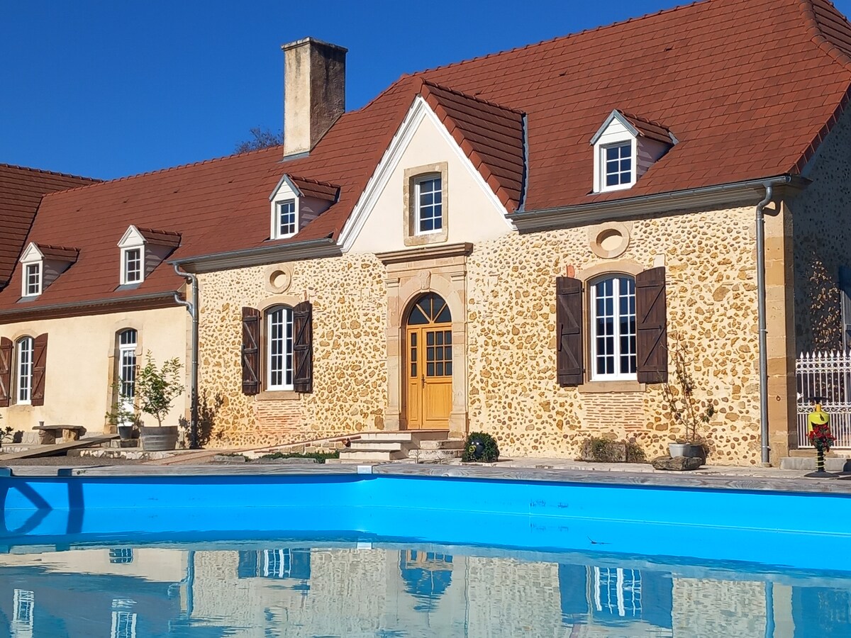 Halika at tamasahin ang isang tahimik na tuluyan na may mga tanawin ng kanayunan para makapagbahagi ng magagandang panahon para sa mga pamilya o grupo ng mga kaibigan. Sa malapit, isang nayon na animated sa pamamagitan ng kanyang Huwebes merkado at maliliit na tindahan at isang magandang lawa para sa paglalakad. Para sa tuluyan, isang na - renovate na lumang kamalig na may kaakit - akit na interior at pool, lahat para makapagpahinga para sa mga holiday! Hanggang sa muli. Brigitte at Didier