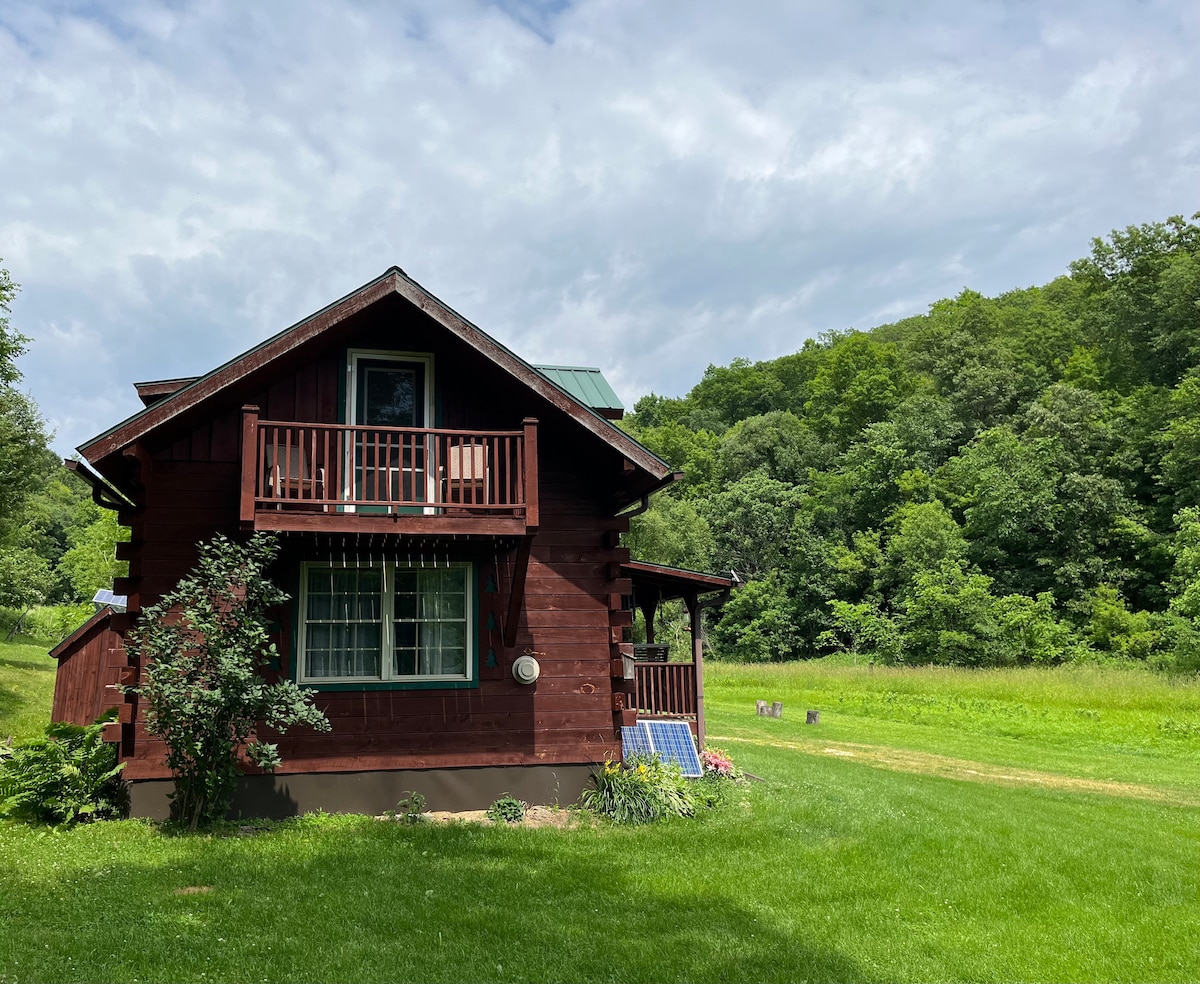 Ang Spring Bank Cabin ay isang 18'x42' mula sa grid cabin na nakatago sa gitna ng mga gumugulong na burol ng walang humpay na lugar, na nakaupo sa 13 acre ng bukas na parang at kagubatan na lupain na may 28'na sakop na beranda! Nilagyan ito ng mga solar panel at generator, at may kumpletong gumaganang paliguan at kusina. Tanungin kami tungkol sa aming diskuwento para sa mga batang 10 taong gulang pababa!
