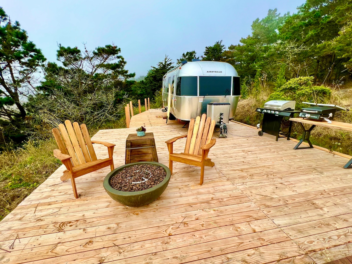 Nasa 9 na pribadong ektarya kung saan matatanaw ang nakamamanghang Beach at Ocean mula sa nakamamanghang tanawin sa tuktok ng talampas. Nakamamanghang paglubog ng araw. Mga tanawin ng surf na may malalaking bintana. Puno ng lahat ng amenidad para maging perpekto ang iyong karanasan sa glamping. Fire pit, sa labas ng BBQ, sa labas ng griddle, Heat, A/C at kumpletong kusina. Kumpletong banyo na may shower. Kung na - book ang isang ito, may tatlong iba pang katulad na Airstream sa property.