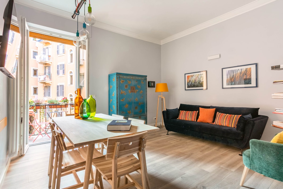 Makukulay na bagong na - renovate na apartment na may masiglang artistikong kapaligiran, 2 minuto lang ang layo mula sa istasyon ng Termini at 5 minuto mula sa istasyon ng metro ng Repubblica. Mahahanap mo ang lahat ng kailangan mo sa panahon ng iyong pamamalagi: kusinang may kumpletong kagamitan na may refrigerator, microwave, washing machine at dish washer; komportableng banyo na may malaking shower cabin; malaking silid - tulugan na may king size na kutson; sofa bed na puwedeng mag - host ng 1 karagdagang bisita; air conditioning, TV at gumaganang gramophone.