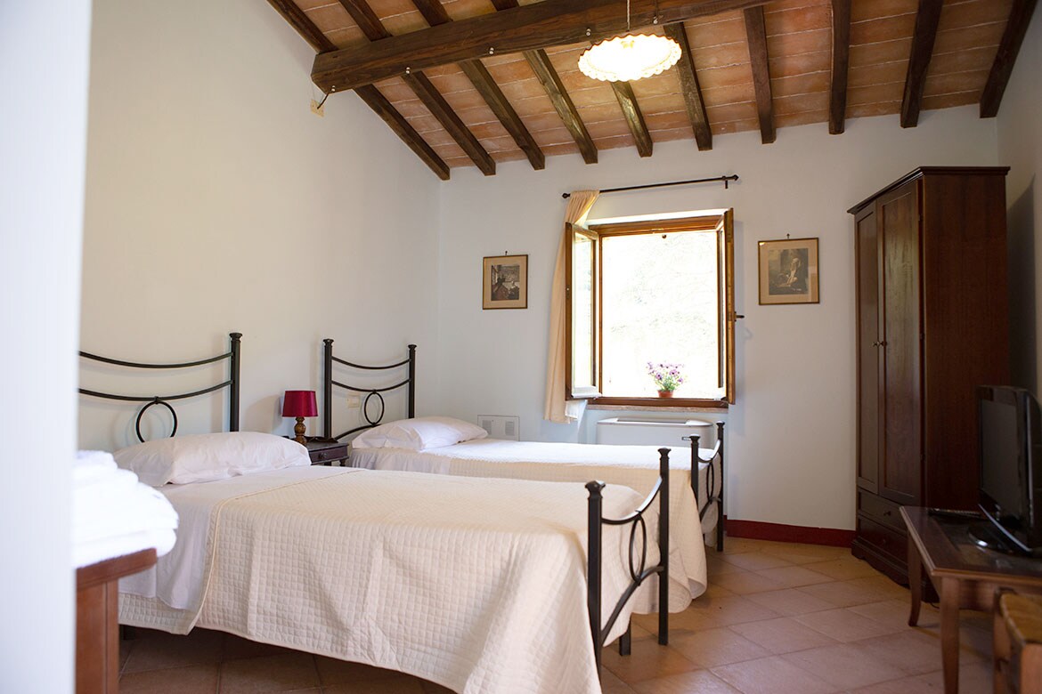 Spacious single rooms in a historic house in the heart of the town of Montefranco, overlooking the Nera river valley. The room is located on the upper floor of the building, and has a bathroom located on the lower floor. The room is accessed via a common area at the complete disposal of guests, with pellet stove and a sofa. A car is recommended as the town is on a hilltop a few km from Terni the main city but a bus connects daily to Terni and the train station but best to check timetable