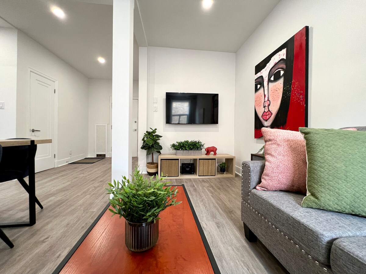 Maligayang pagdating sa iyong tahimik na tahanan na malayo sa bahay! Ang ganap na na - renovate na one - bedroom na basement suite na ito ay nakatago sa isang mapayapang kapitbahayan - perpekto para sa pagrerelaks pagkatapos ng isang araw ng pamamasyal o trabaho Matulog nang maayos sa komportableng queen - size na higaan, at samantalahin ang convertible na sofa bed - mainam para sa mga maliliit na pamilya o dagdag na bisita Punong - puno ang kusina ng mga pangunahing kailangan Bumalik gamit ang iyong mga paboritong palabas sa smart TV, na sinusuportahan ng high - speed na Wi - Fi - streaming at nakakarelaks na ginawang simple