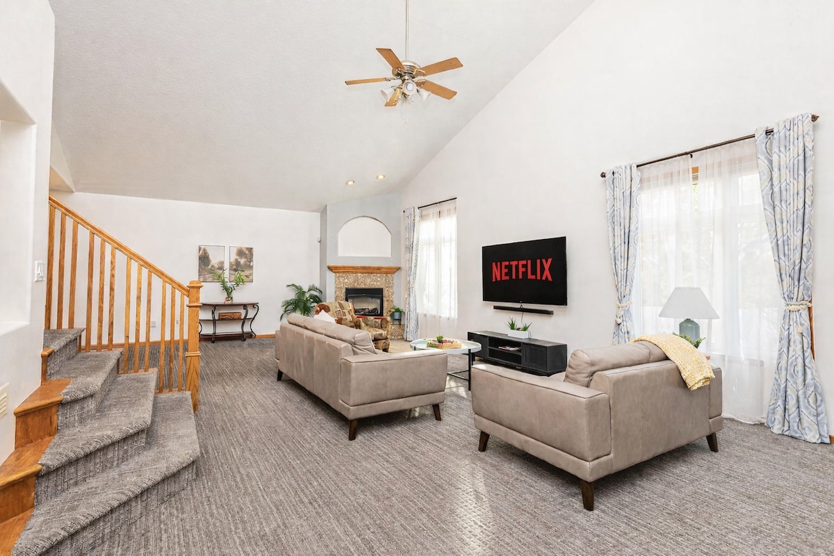 Makakatulog ng 8 komportableng higaan at de - kalidad na sapin. Hot tub para sa dalawa, 70" TV, leather reclining sofa, deck w/outdoor dining table, wood pellet & gas grill, dagdag na imbakan, computer na may 500 mbps, ethernet din. Ang na - update na oven, refrigerator, microwave, dishwasher, blender, coffee maker. 1 king bed, 2 queen bed, sofa sleeper, at xtra mattress, lahat ay may xtra memory foam! Ang Tv ay may naka - install na Netflix, YouTube, at Peacock. Ang nakatalagang pin ay magbibigay sa iyo ng access sa pagpasok at hindi na kailangang magkaroon ng face - to - face na pag - check in