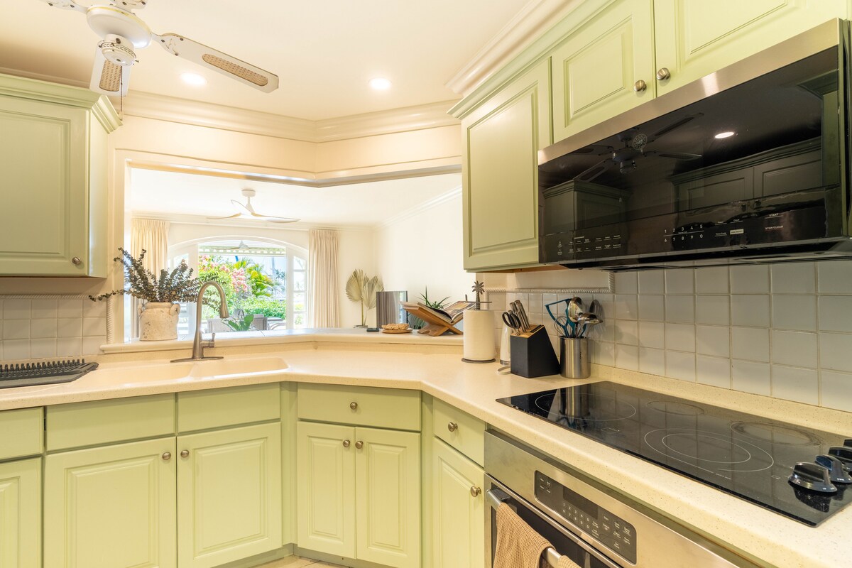 Ang 1 - bed apartment na ito, ay may malaking pribadong sakop na outdoor dining area na may tanawin ng dagat. Matatagpuan sa mapayapang 10 acre plantation, na napapalibutan ng mga rolling field ng tubo. Isang magandang 40 talampakan ang pinaghahatiang saltwater pool na may barbecue area at karagdagang shared dining covered area. Konektado ang property sa mga trail sa paglalakad sa pamamagitan ng mga tubo at kagubatan. 7 minutong biyahe lang papunta sa beach. Magrelaks sa natatangi at tahimik na property na ito.