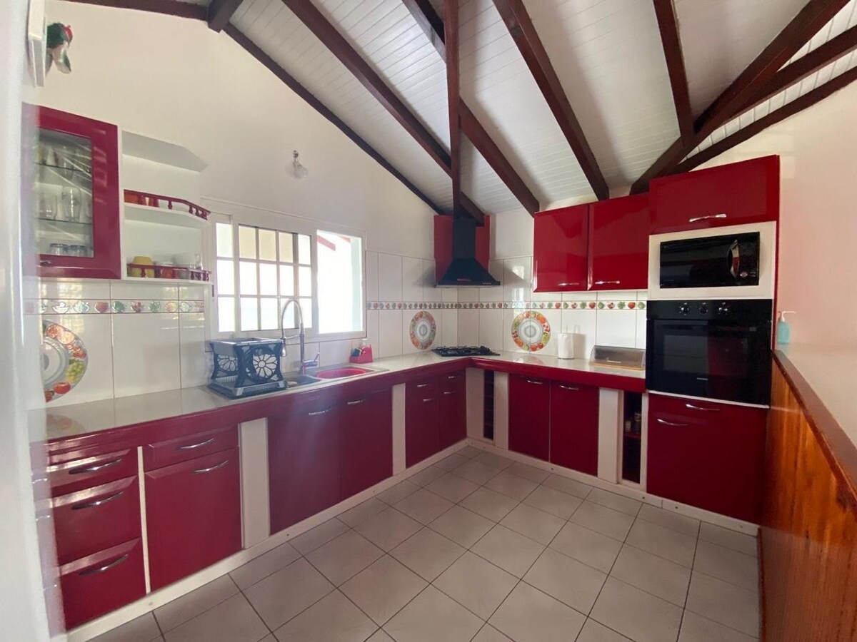 110m² na bahay na may magagandang tanawin ng Caribbean Sea at ng isla ng Montserrat. Ang accommodation sa ibaba ng isang villa ay ganap na pribado at may 3 silid - tulugan, 2 nito ay may access sa isang malaking banyo. Nilagyan ang ikatlong kuwarto ng pribadong banyong may massaging bathtub. Nilagyan ang lahat ng kuwarto ng malalaking king size bed, smart 65"TV, fiber internet. Sala na may kusina na bukas sa terrace Kasama sa presyo ang paglilinis para sa katapusan ng pamamalagi at paglilinis sa araw - araw.