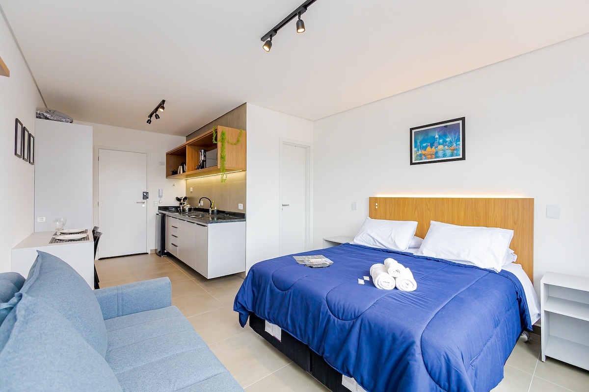 Studio na may mga amenidad, balkonahe at magandang lokasyon Malapit sa Bacacheri Park, mga supermarket, panaderya, botika, at PUB Maingat na idinisenyo ang aming tuluyan para maging komportable at maginhawa ang mga bisita NAGBIBIGAY KAMI NG MGA KUMOT, TUWALYA, LIQUID SOAP PARA SA PAGLIGO AT KAPE. Bukod pa sa ginhawa ng property, magagamit ng mga bisita ang 24 na oras na labahan sa condominium at ang nakamamanghang tanawin ng lungsod mula sa terrace Ligtas na tuluyan na may doorman Saklaw na garahe.