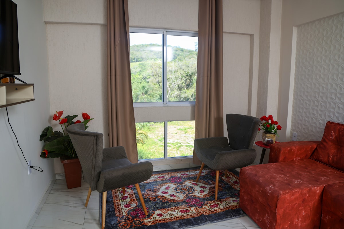 Relaxe neste lugar único e tranquilo. Sem taxa de limpeza. Um dos apartamentos mais equipados de Criciúma, conta com lava e seca, todos os aparelhos eletrodomésticos para vc fazer refeições sem se preocupar, tv 65” na sala, tv no quarto, ar condicionado, dois banheiros com duchas quentinhas, cama super confortável, muito bem localizado ao lado da Abba Pai, próximo ao trevo que liga as cidades de Içara, Morro da Fumaça e Cocal do Sul, pertinho da Via rápida. Vaga de garagem coberta.
