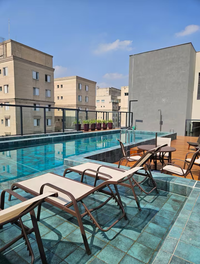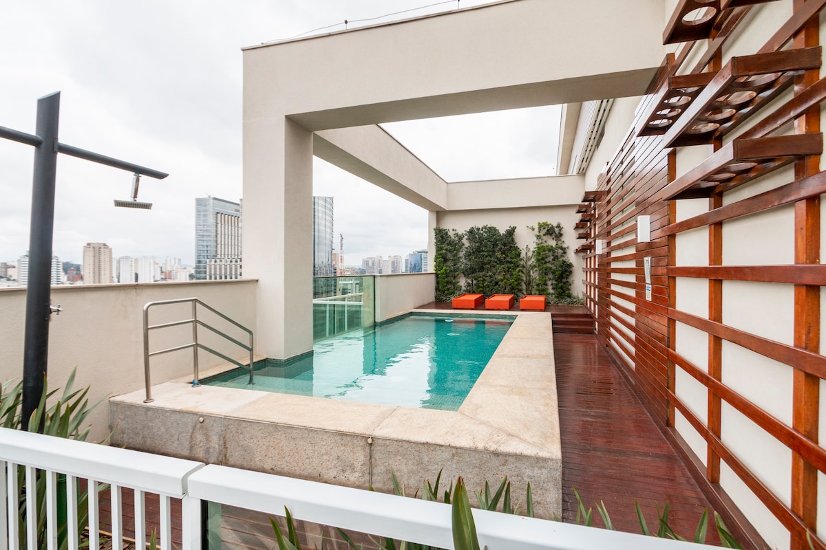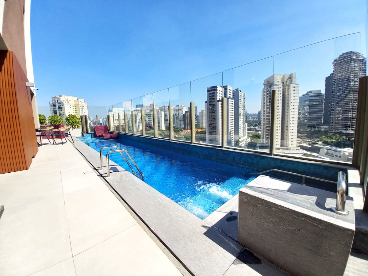 Bago at malawak na apto para sa hanggang 4 na tao (1 double bed at 2 single bed). Pinalamutian ng arkitekto na may modernong kapaligiran at lahat ng kaginhawaan, kumpletong paglilibang sa Rooftop na may Pool at Sauna sa ika -19 na may pribilehiyo na tanawin ng lungsod ng São Paulo Pribilehiyo ang lokasyon sa Rua das Margaridas, 308, ilang metro mula sa Brooklin subway, malapit sa American Consulate, hanggang sa Shopping Morumbi. Bukod pa sa mga panaderya, convenience store, at botika, ilang hakbang lang ang layo ng lahat. BASAHIN ANG IMPORMASYON SA IBABA: