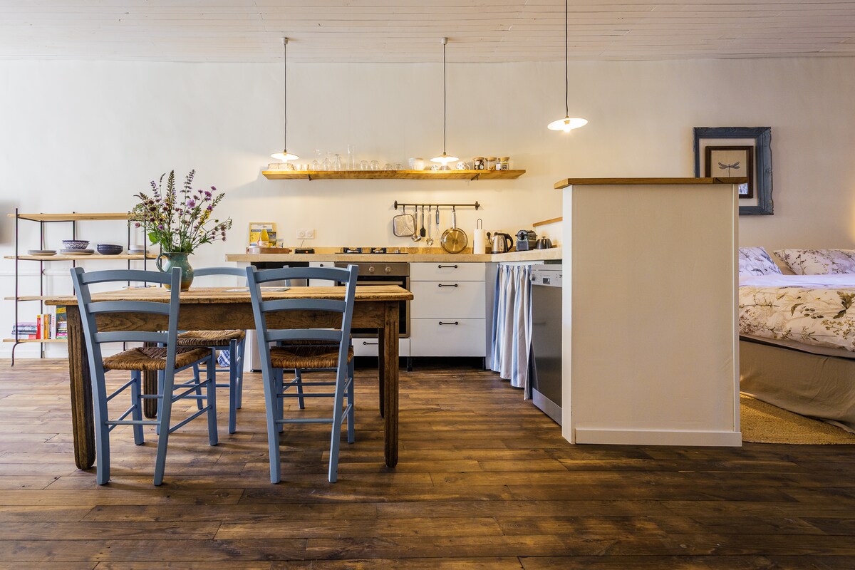 Sa komportable at maluwang na apartment na ito na mahigit 50 m², na mula pa noong mga 1640, magandang mamalagi. Dahil sa tunay at makapal na natural na mga pader na bato, nananatiling kahanga - hangang cool ito sa tag - init. Naghihintay na sa iyo ang mga tuwalya, sapin sa higaan, at tuwalya sa kusina, at puwede mong gamitin nang libre ang aming hardin at natural na swimming pool. At siyempre: malugod na tinatanggap ang lahat sa amin. Kami ay LGBTQI+ - magiliw at naniniwala kami sa isang lugar kung saan ang lahat ay pakiramdam na libre at nasa bahay!