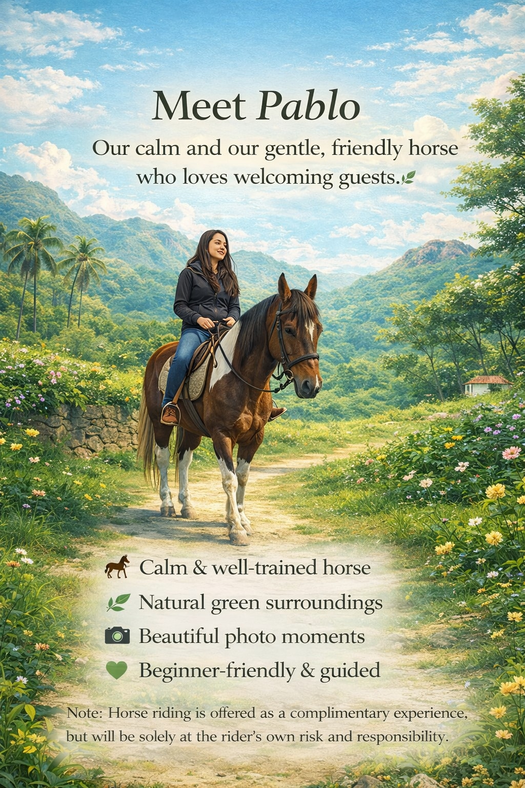 Magrelaks kasama ang buong pamilya sa mapayapang lugar na matutuluyan na ito. Kung gusto mong lumayo sa karamihan ng tao at sa kapayapaan, ito ay isang magandang lugar. Masisiyahan ka sa mga bundok, halaman, puno ng palmera sa paligid at sa magandang tunog ng mga ibon sa umaga at gabi. Mayroon ding restawran sa hardin