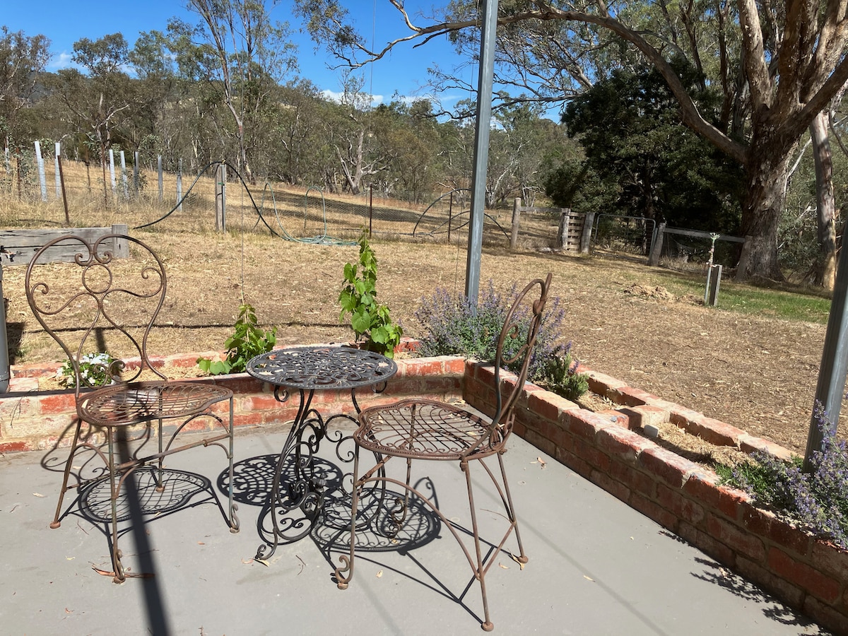Isang makasaysayang libreng gusali sa aming 12 acre na property na "Claremont" (clink_57), ang Garden Cottage ay ganap na inayos upang mag - alok ng isang natatanging lugar na matutuluyan sa maganda, mapayapa at makasaysayang kapaligiran. Ganap na pribado ang tuluyan, na may queen bed, en suite na banyo at mga pangunahing pasilidad sa paghahanda ng pagkain (refrigerator, microwave, toaster at takure). Mayroon itong split system para sa heating at cooling. Tinatayang 3.4 km ang layo ng Garden Cottage papunta sa gitna ng Castlemaine township, at maigsing lakad lang ito papunta sa magandang Botanical Gardens.
