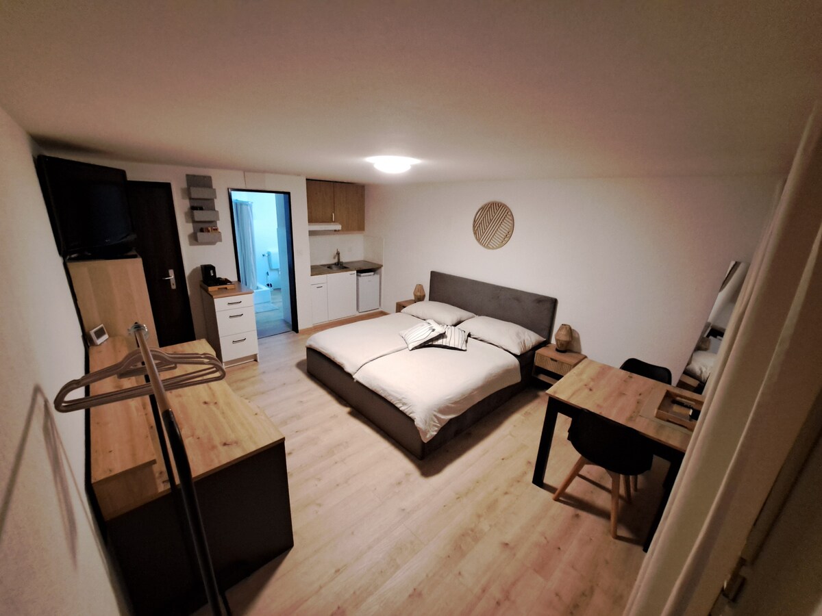 Nasa magandang lokasyon ang kaakit - akit na accommodation na ito. Malapit sa bayan at malapit sa kanayunan. Duplex apartment na may itaas na bahagi kabilang ang malaking master bedroom. Sa ibabang bahagi, may malaking sala na may 1 sofa bed, sofa, kusina at banyo. Balkonahe Malayang access May paradahan para sa paradahan