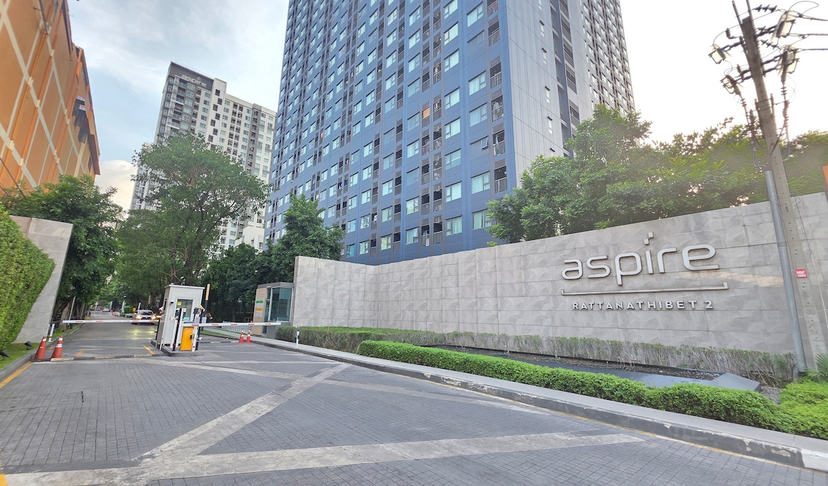 Condo sa pangunahing kalsada (na may kusina, 1 BR, 2 aircon ,gym, swimming pool, smartTV at WiFi). Matatagpuan sa Nonthaburi, 3 minutong lakad lang papunta sa MRT purple line na Bang Kraso Station (gumamit ng exit 4 na lakad sa aking patuluyan 1 minuto lang) na talagang maginhawa para sa iyo na maglakbay sa Bangkok at malapit sa Central Plaza Shopping Mall (10 minutong lakad), Don Muang Airport DMK Airport), Big C Super Store (5 minutong lakad). Napakabilis at madaling pumunta sa gitna ng Lungsod.