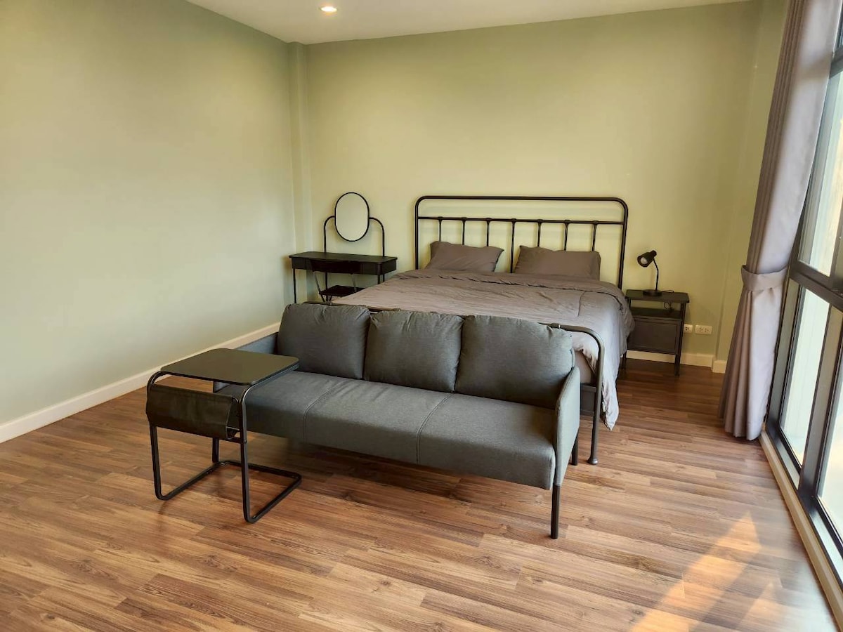 Dalhin ang buong pamilya sa tuluyang ito na may magandang disenyo na nilagyan ng lahat ng kailangan mo para sa komportable at nakakarelaks na pamamalagi. Mga Highlight: • 2 palapag na hiwalay na bahay • 200 sqm ng living space • Nakatalagang paradahan ng kotse. • 2 Kuwarto na may King - sized na higaan • 2 Banyo at Jacuzzi • Kusina na may kumpletong kagamitan • Maluwang na Hardin Malapit: • DMK Airport (10 km) • IMPACT Arena Muang Thong Thani • MRT Dark Red Line • Mga Golf Club Nagbibigay ng walang aberyang access para tuklasin ang Bangkok sa pamamagitan ng kotse o pampublikong transportasyon.