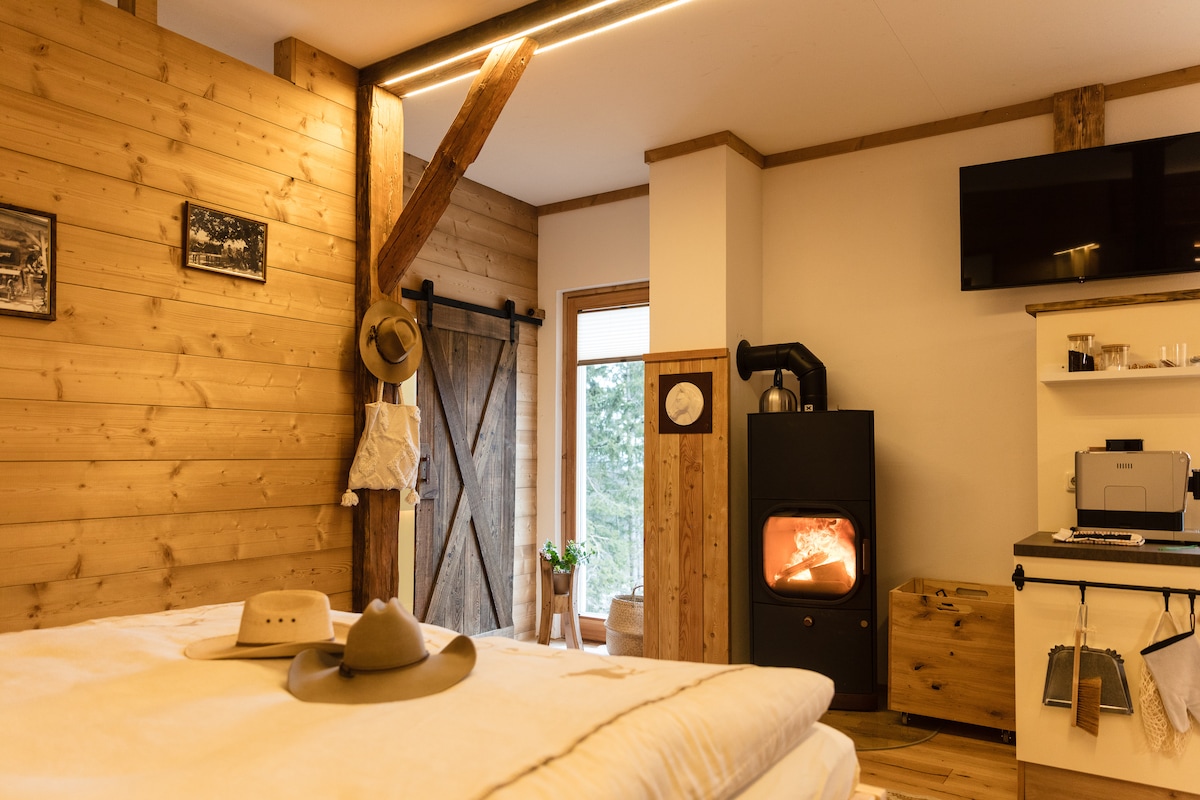Damhin ang kalayaan ng Wild West! Ang Munting Bahay na Wild West ay nakatayo mismo sa itaas ng lawa sa gitna ng mga pastulan, kung saan ang mga baka ay malayang naglilibot at ang kapayapaan ay nababagabag lamang sa pamamagitan ng pag - crack ng apoy. Magrelaks sa hot tub na may massage system, maligo sa lawa o subukang mahuli ang sarili mong isda. Tanned wood, ang amoy ng kalikasan at kumpletong privacy - narito ka lang, kalikasan at kalayaan. At kung hindi sapat para sa iyo ang isang lawa. 100 metro papunta sa timog - kanluran, makakahanap ka ng isa pang lawa sa gitna ng ilang.