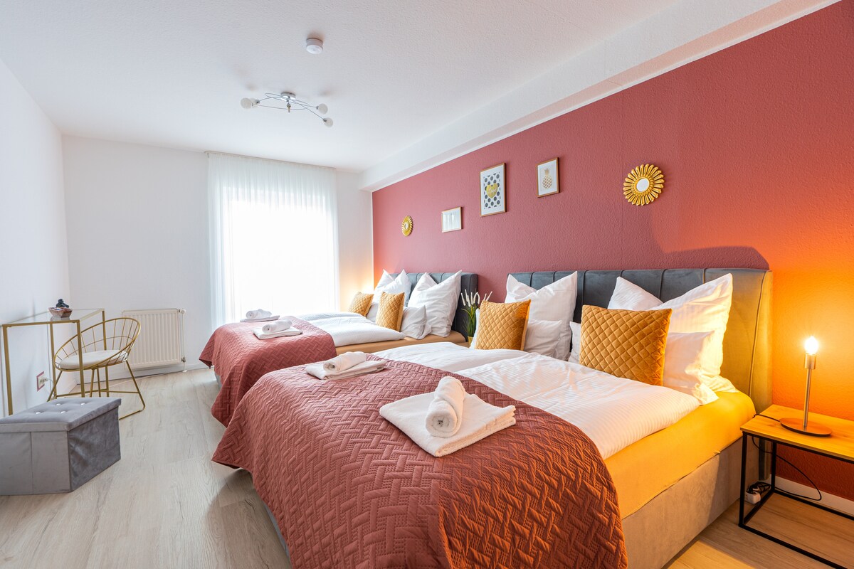 Apartment sa ✔ sahig na95m² ✔ Bus/tren nang direkta sa harap ng pinto ✔ 3 Queen - size na higaan ✔ 24 na oras na sariling pag - check in ✔ Mag - aral gamit ang high - speed na Wi - ✔Fitness corner na may mat, maliliit na dumbbells, mga training band at fascia roll ✔ Kumpletong kagamitan sa kusina ✔ Mga sariwang linen at tuwalya at mga produkto para sa kalinisan ✔ Smart TV ✔ masusing paglilinis at propesyonal