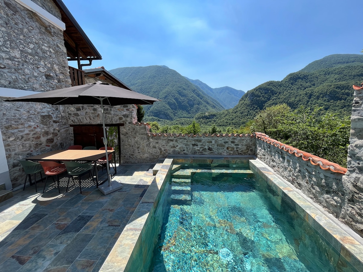 Matatagpuan ang bahay na ito na bagong ayos sa isang maliit at tahimik na nayon sa 5 minuto mula sa Kobarid. May isang malaking sala na may kusina, 3 silid - tulugan at 2 banyo. Isang magandang terrace na may swimming pool. Sa gitna ng Nadiža at Soča Valley, ang travel base na ito ay nagbibigay - daan sa iyo upang matugunan ang lahat ng iyong mga kagustuhan. Sa isang tahimik na kapaligiran na napapalibutan ng mga bundok, ilog, upang mag - hiking, pagbibisikleta, panlabas at water sports, pag - akyat, paragliding... Malapit sa sikat na restaurant Hiša Franko