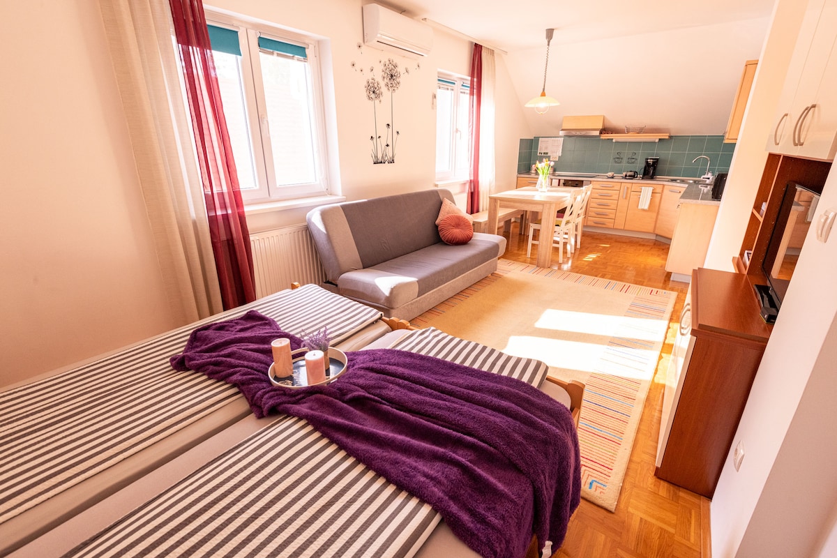 Nasa agarang sentro ng lungsod ang mga Kuwarto na Poldka. Ang lugar ay nailalarawan sa pamamagitan ng lumang burges na konstruksyon, at nagtatampok ito ng mga mataas na kisame at pader na nagpapanatili sa nakaraan. Ang mga amenidad ay moderno, ang bawat isa ay may sariling banyo, refrigerator, induction hob, at lahat ng mga kagamitan sa mainit na inumin. May access ang mga bisita sa balkonahe at common area na may kaakit - akit na naibalik na mga vintage na piraso. Hino - host ka ni Barbara, na nagho - host para sa ikaapat na henerasyon ng mga host sa bahay. Siya ay isang mamamahayag, na may malawak na kaalaman sa nakapaligid na lugar at sa bansa.