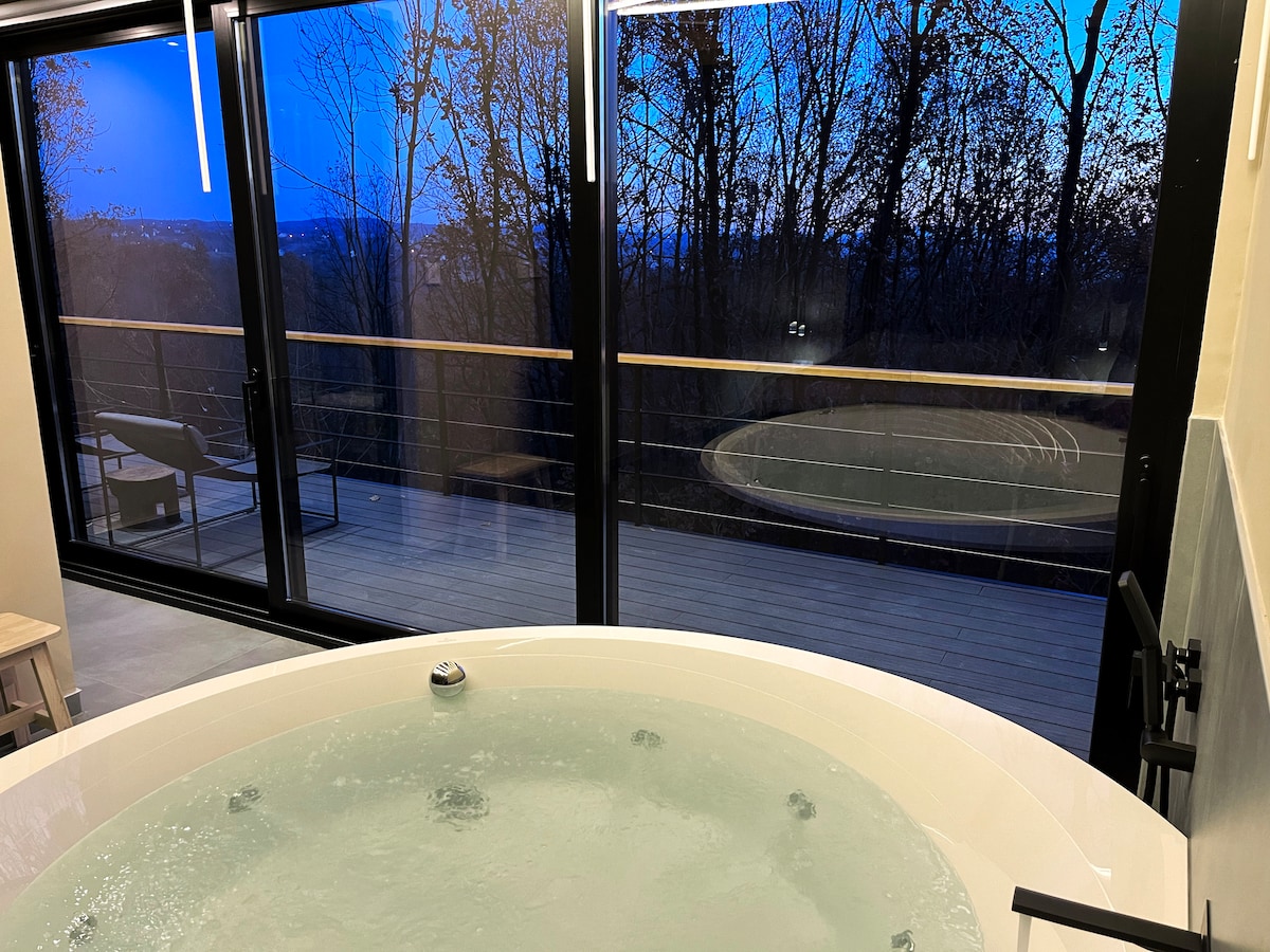 Bahay - bakasyunan sa kagubatan, 30 minuto ang layo mula sa sentro ng lungsod. Nag - aalok ng sauna at maluwang na hot tub para makapagpahinga sa magandang tanawin na may malaking patyo na napapalibutan ng mga puno.