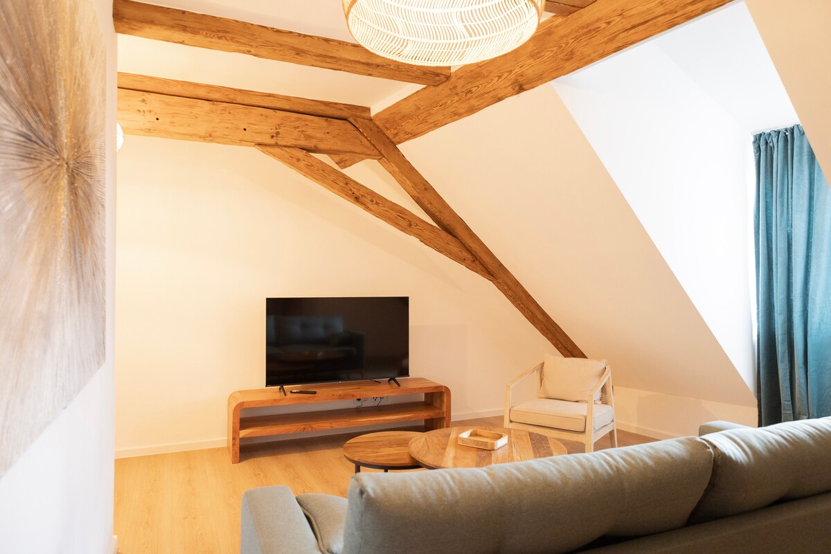 Sa ilalim ng mga beam ng bubong ng dating bukirin, inaanyayahan ka ng aming loft sa isang espesyal na sala at silid‑tulugan na may solidong sahig na oak at mga tropikal na halaman. Nagtatampok ang magaan at modernong banyo ng malaking wellness/rain shower at eleganteng disenyong lababo. May oven na may ceramic hob at extractor hood, dishwasher, at malaking freestanding fridge na may freezer compartment ang praktikal at modernong kusina.
