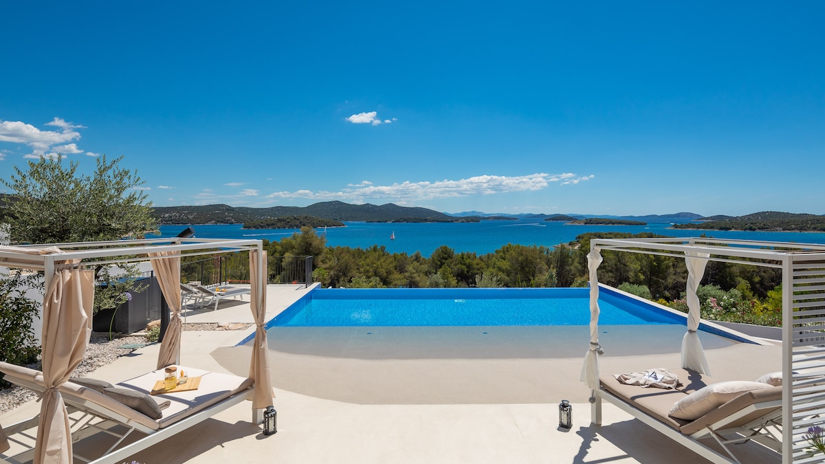 Matutugunan ng bagong marangyang 5* Villa na ito ang mga pangangailangan ng sinumang gustong mamalagi sa Dalmatia sa modernong villa na may mga marangyang amenidad. Matatagpuan ang villa sa magandang Dalmatian city ng Biograd na Moru na nasa kalagitnaan ng Šibenik at Zadar. Biograd na Moru ay isang idyllic Dalmatian lungsod na kilala bilang ang pinaka - indented na bahagi ng Croatian coastline na kung bakit ito ay lalo na popular sa mga marinero.