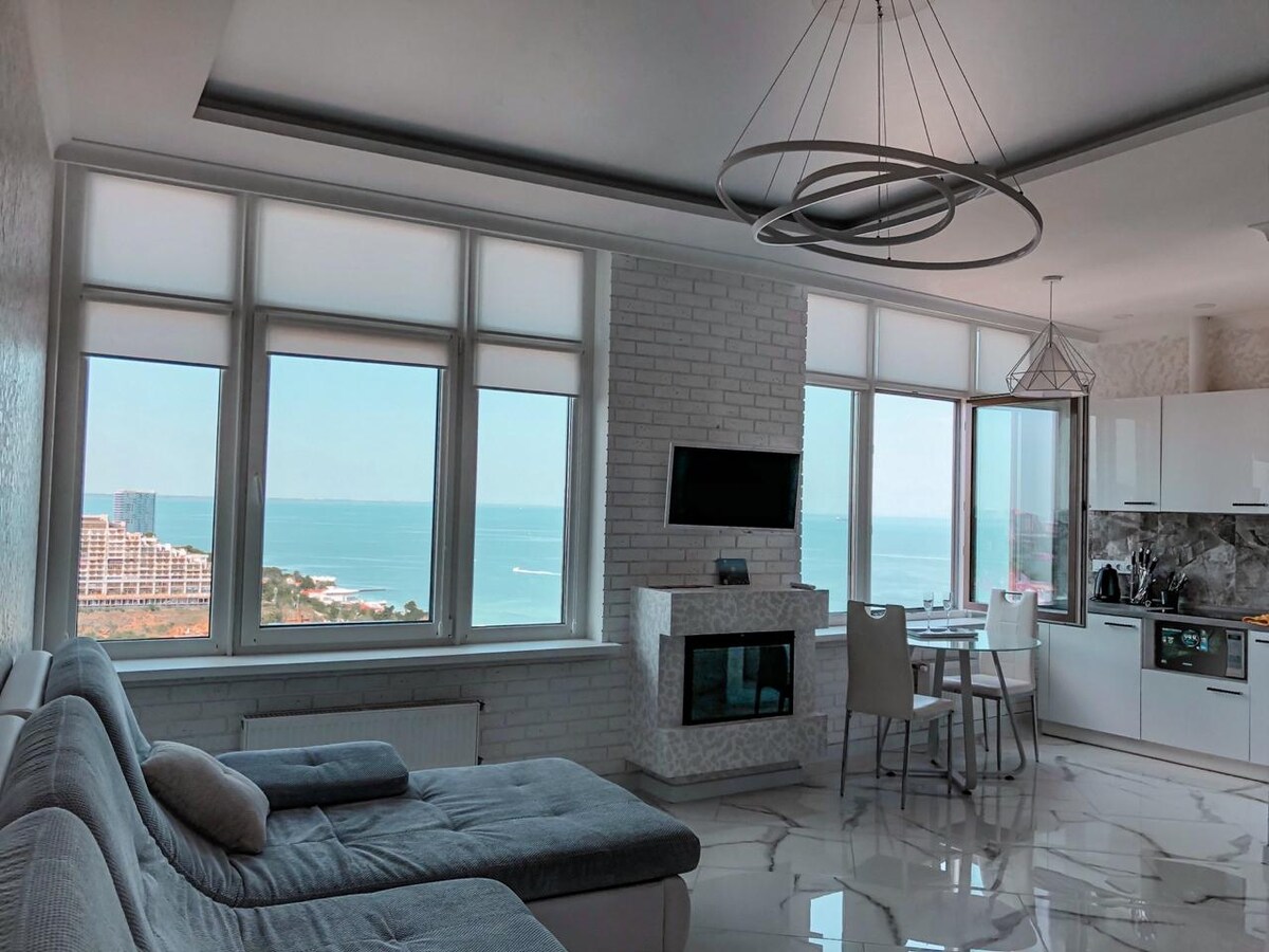 Halika rito kasama ang buong pamilya. Matatagpuan ang apartment sa lugar ng resort ng Odessa, ika -12 istasyon ng Big Fountain, 5 minuto mula sa dagat. Maaari mong sabihin na ang bahay ay nasa teritoryo ng botanical garden - kaya berde at mahusay na disenyo ng landscape. Binubuo ang buong complex ng mga mababang gusali, na may 24 na oras na seguridad, paradahan sa ilalim ng lupa. Palaruan ng mga bata, lugar ng barbecue, maraming lugar na libangan. Nasa ika -4 na palapag ang apartment, na may tanawin mula sa mga malalawak na bintana at balkonahe hanggang sa magandang patyo na may fountain.