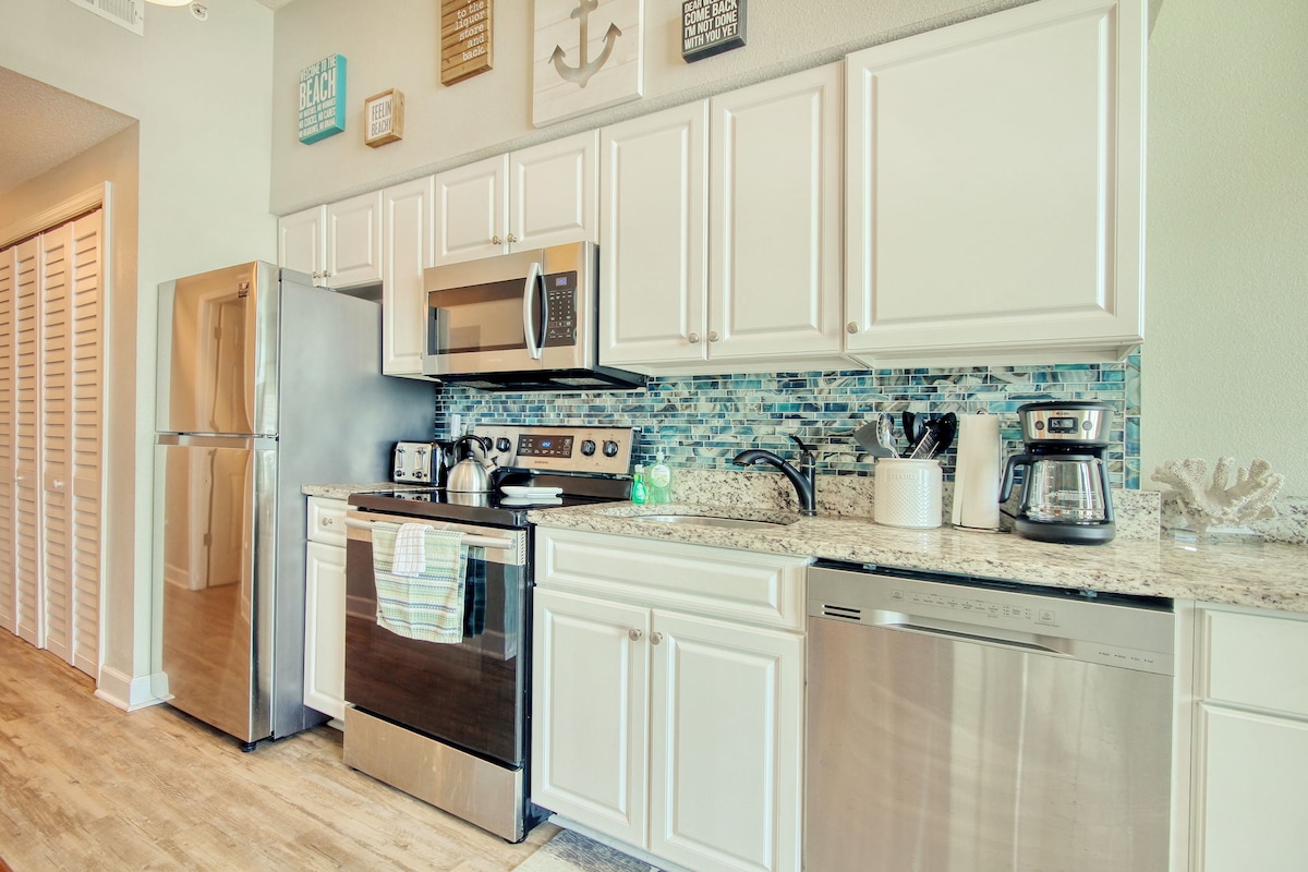 Makatakas sa katotohanan sa maluwang at totoong 1 silid - tulugan na ito, na iniangkop na condo na may mga nakamamanghang tanawin. Simulan ang iyong araw sa pamamagitan ng pag - enjoy sa pagsikat ng araw mula sa pribadong balkonahe na may sariwang tasa ng kape o habang naglalakad sa gilid ng tubig sa labas mismo ng iyong pinto. Gugulin ang iyong mga hapon na nakakarelaks sa beach, magbabad sa maraming pool o dolphin spotting mula sa condo. Sa gabi, tingnan ang magagandang restawran at atraksyon sa lugar; o magrelaks sa loob at samantalahin ang kumpletong kusina.