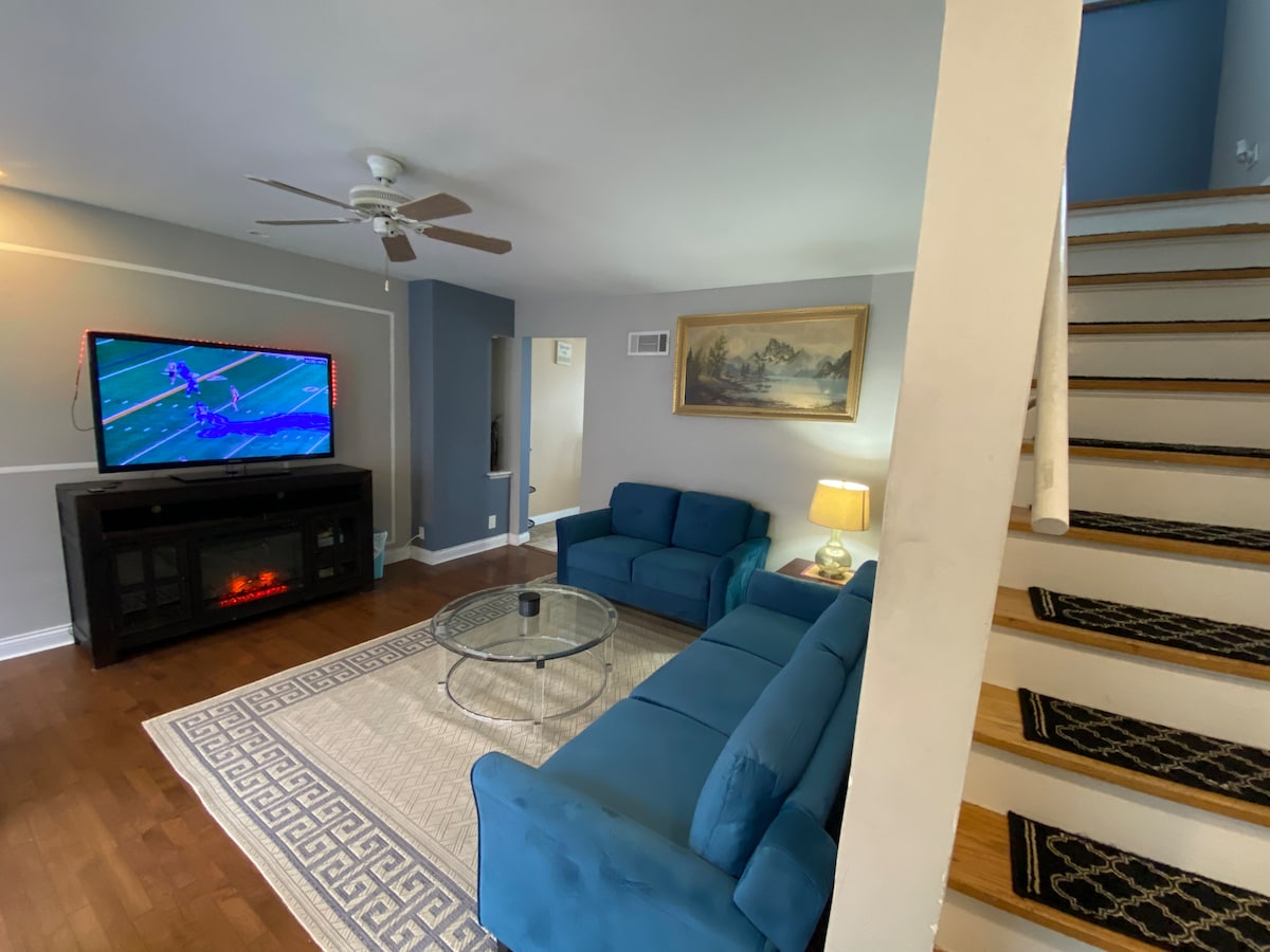 Malinis at maayos na itinalagang mas mababang antas ng tuluyan na tinitirhan ng may - ari na may pribadong in/out access na hiwalay sa pangunahing antas. Kasama sa suite - style na tuluyan ang isang mapagbigay na sala na may dalawang malaking couch, 49" smart TV w/ sound system, king bed, full bathroom, kitchenette w/ table, washer/dryer at work desk. Magandang lokasyon 5 -10 minuto mula sa O'Hare, Allstate Arena, Rosemont at Rivers Casino na may maraming opsyon sa transportasyon. Malapit lang ang property sa mga grocery store, gym, parke, at marami pang iba.