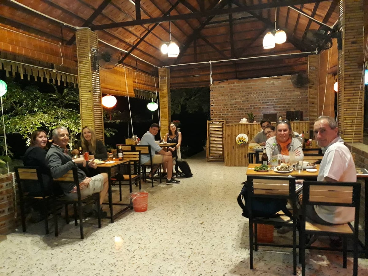 Ito ay isang modelo ng Vila Homestay, na may isang cool na sariwang tahimik na lugar sa ilalim ng lilim ng mga sinaunang puno ng prutas. Sa paligid ng bahay ay may magandang malinis na campus.! Naghahain ang property ng American o Asian breakfast. On site restaurant na naghahain ng iba 't ibang pagkaing Asian at pati na rin ng vegetarian menu na walang itlog, gatas. Puwede ring magbisikleta at mangisda ang mga bisita sa malapit o magrelaks sa hardin. Lalo na nagustuhan ito ng mga mag - asawa dito