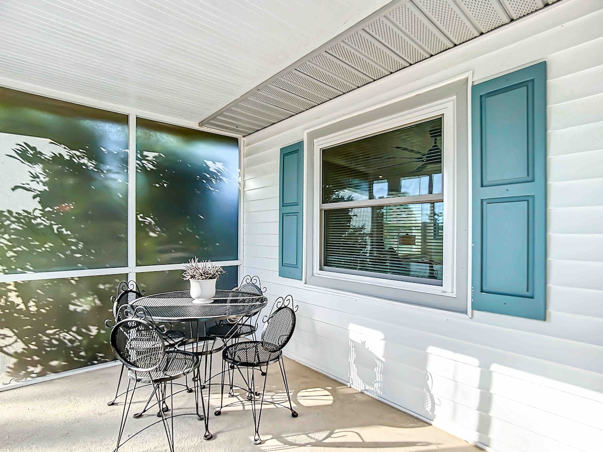 Matatagpuan nang wala pang One Mile mula sa Beach sa Center of the City Hustle, malumanay na ipinapaalala sa iyo ng Open Spaces & Bright Beachy Vibes kung bakit ka dumating! Nagbubukas ang mga French Door sa parehong Bdrms sa isang Magandang Screened Lanai na may Outdoor Dining & BBQ Overlook a Little "Beach". May King Bed at Ensuite Bathroom na may Shower ang Master Bdrm; may 2-Twin o King Bed at Hall Guest Bathroom ang karagdagang Guest Bdrm. Ibinabahagi ng ganap na na - renovate na cottage na ito ang 1.62 acre na may katabing bahay at idinisenyo ito para sa ganap na privacy.