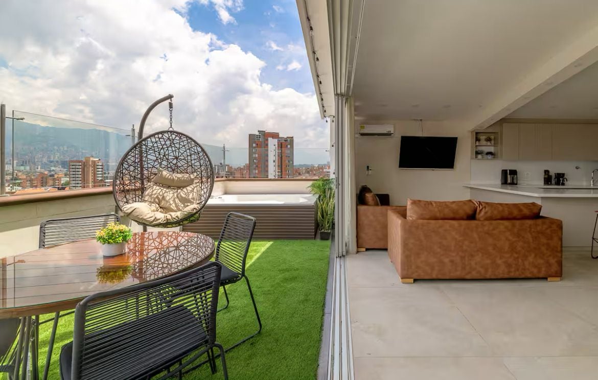 Masiyahan sa iyong penthouse na puno ng kapayapaan sa Laureles. Ginagarantiyahan ng 2 kuwartong may Queen bed at air conditioning ang nakakapagpahinga. Mayroon itong workspace, high - speed na Wi - Fi, maluwang na kusina, silid - kainan. Sa paglubog ng araw, magrelaks sa pribadong terrace na may panlabas na sala at Jacuzzi. Matatagpuan ito sa isang ligtas at tahimik na lugar, 3 bloke lang mula sa maraming alternatibo ng mga restawran, cafe at tindahan ng iba 't ibang uri, malapit sa mga shopping center at stadium ng Atanacio Girardot. Nasasabik kaming makita ka