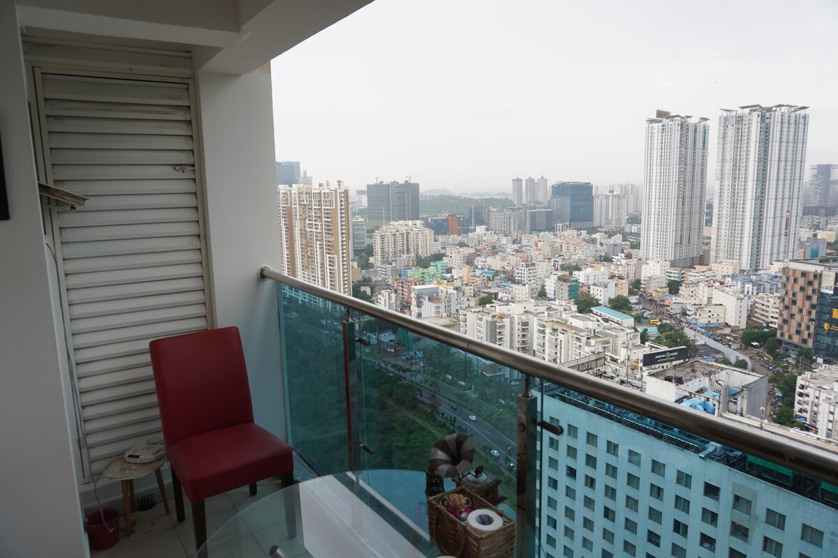 Maligayang pagdating sa iyong tahimik na pagtakas sa kalangitan, isang eleganteng high - rise na apartment na matatagpuan sa isa sa mga pinaka - hinahangad na komunidad ng Hyderabad. Matatagpuan sa masiglang Financial District, ang naka - istilong flat na ito ay nag - aalok ng perpektong timpla ng modernong kaginhawaan, mga nakamamanghang tanawin at walang kapantay na kaginhawaan na perpekto para sa mga business traveler, mag - asawa, digital nomad at pamilya. Mga Panoramic na Tanawin, Eleganteng Interior Gumising sa malawak na tanawin ng skyline ng Hyderabad at maaliwalas na kapaligiran mula sa kaginhawaan ng iyong higaan.