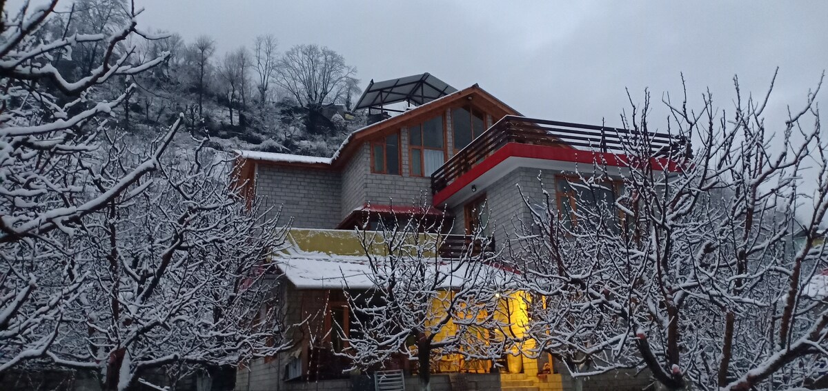 Ang "Apple Blossom" ay isang magandang homestay sa isang kaakit - akit na nayon na tinatawag na Sajla, sa labas ng Manali at bahagi ito ng lokal na Himachali family home. Matatagpuan ang bahay sa isang maginhawang lokasyon sa labas mismo ng kalsada ng Manali - Naggar, na napapalibutan ng halamanan ng mansanas. Ang bahay ay may mga kamangha - manghang tanawin ng mga bundok na nakasuot ng niyebe sa isang panig at ang maaliwalas na berdeng pine forest sa kabilang panig. Kung nais mong maranasan ang pamumuhay sa isang magandang nayon ng Himachali..ito ang lugar.