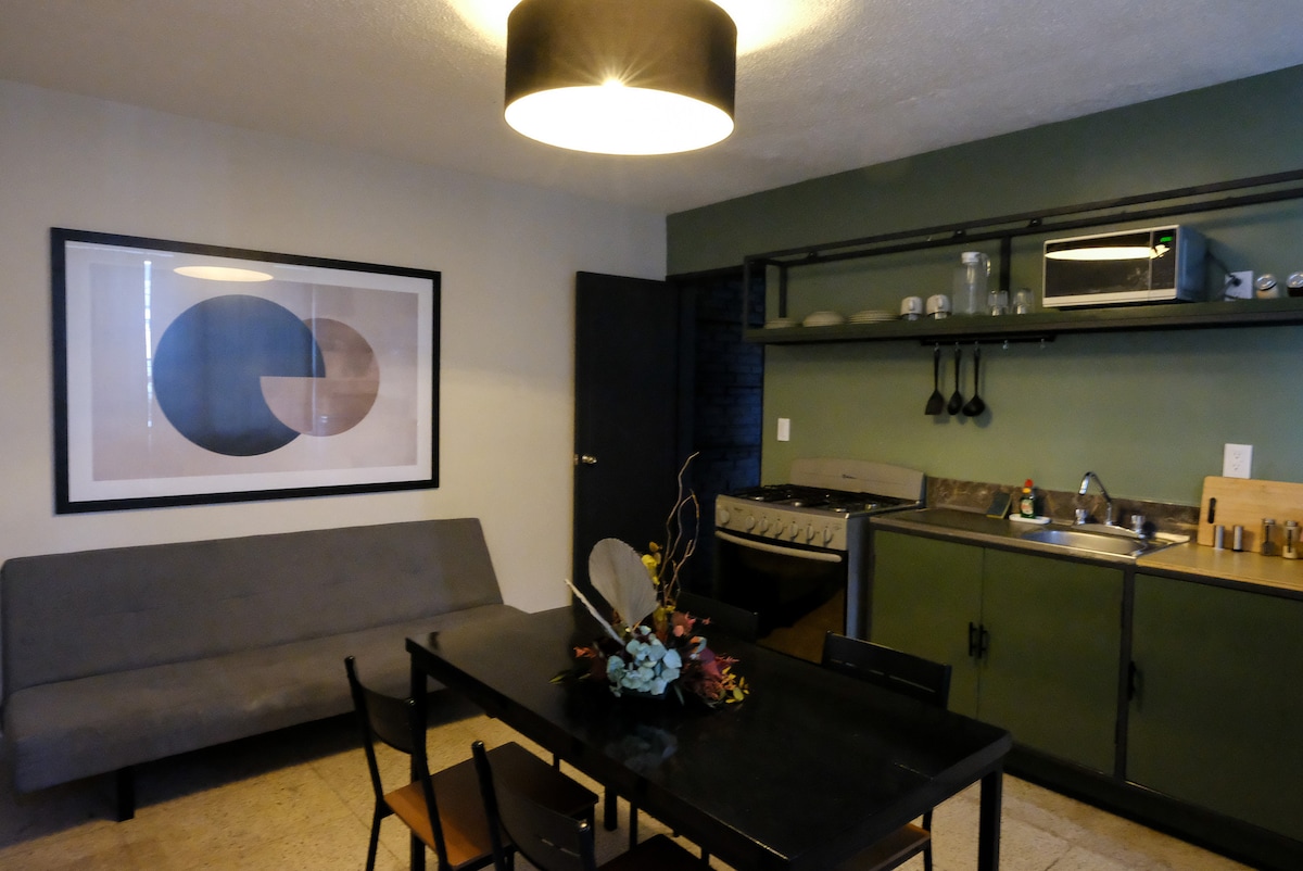 Maluwag at pribadong apartment na idinisenyo para sa kaginhawaan, privacy, at pagsasarili. Ito ang pinakamalaking unit sa gusali, na matatagpuan sa ground floor na may sariling pribadong pasukan, kaya mainam ito para sa mga biyaherong naghahanap ng madaling access at tahimik na pamamalagi. May hiwalay na kuwarto, pribadong banyo, at komportableng sala na may kusina ang apartment na perpekto para sa mga panandaliang pamamalagi, business trip, o mas matatagal na pagbisita sa Mexico City. Magagamit din ng mga bisita ang nakabahaging rooftop terrace.