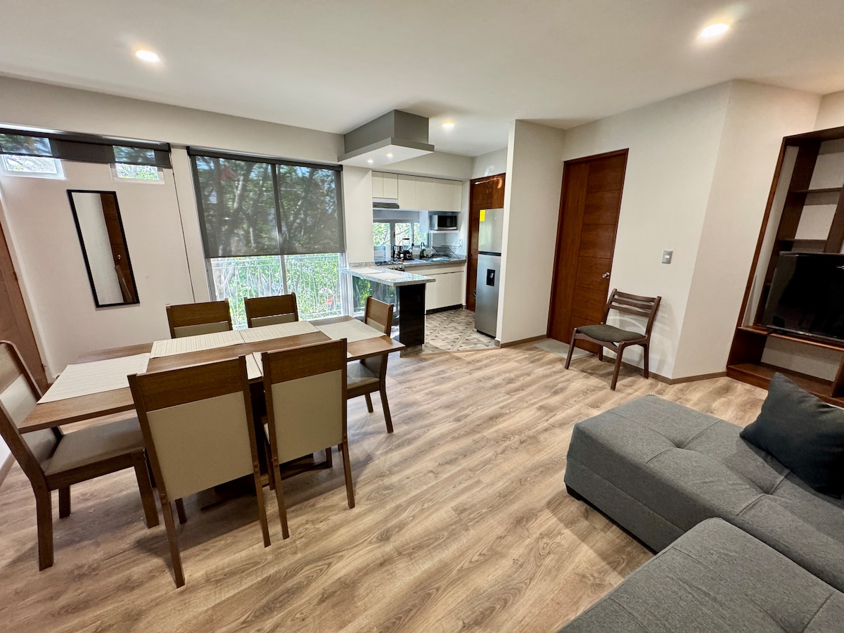 Mamalagi sa timog - gitnang lugar ng Lungsod ng Mexico at mag - access sa downtown, Coyoacán, at San Angel sa pamamagitan ng subway. Bagong inayos na apartment na may dalawang silid - tulugan, silid - kainan, kusina, sala at silid - kainan. Ang sala ay may terrace kung saan matatanaw ang likod - bahay, perpekto para sa almusal, pagtatrabaho sa labas, o pagbabasa sa hapon. Ilang bloke ang layo ng simbahan, merkado, tortilleria, at Oxxo kung saan mabibili mo ang kailangan mo para maihanda ang iyong pagkain. 3 minutong lakad ang layo ng Metro line 2.