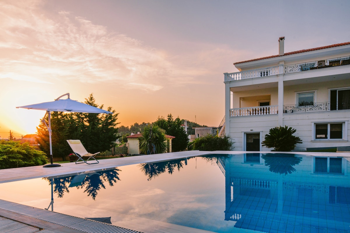 45 klm lamang ang layo mula sa Athens at malapit sa Evia Island, ang aming villa ay angkop para sa mga pamilya, kaibigan at mag - asawa na gustong makaranas ng natatangi, mapayapa at marangyang bakasyon sa magandang 420 sq.m. villa na ito sa Greece na may malaking swimming pool. Ang beach, mga tindahan, supermarket, cafe at restaurant ay 3klm sa pamamagitan ng kotse. Naka - air condition ang lahat ng kuwarto. Tangkilikin ang table tennis, volleyball court, billiards, Xbox na may Game pass (400 laro) at napakalaking terraces na may pinakamahusay na sunset na iyong nakita!