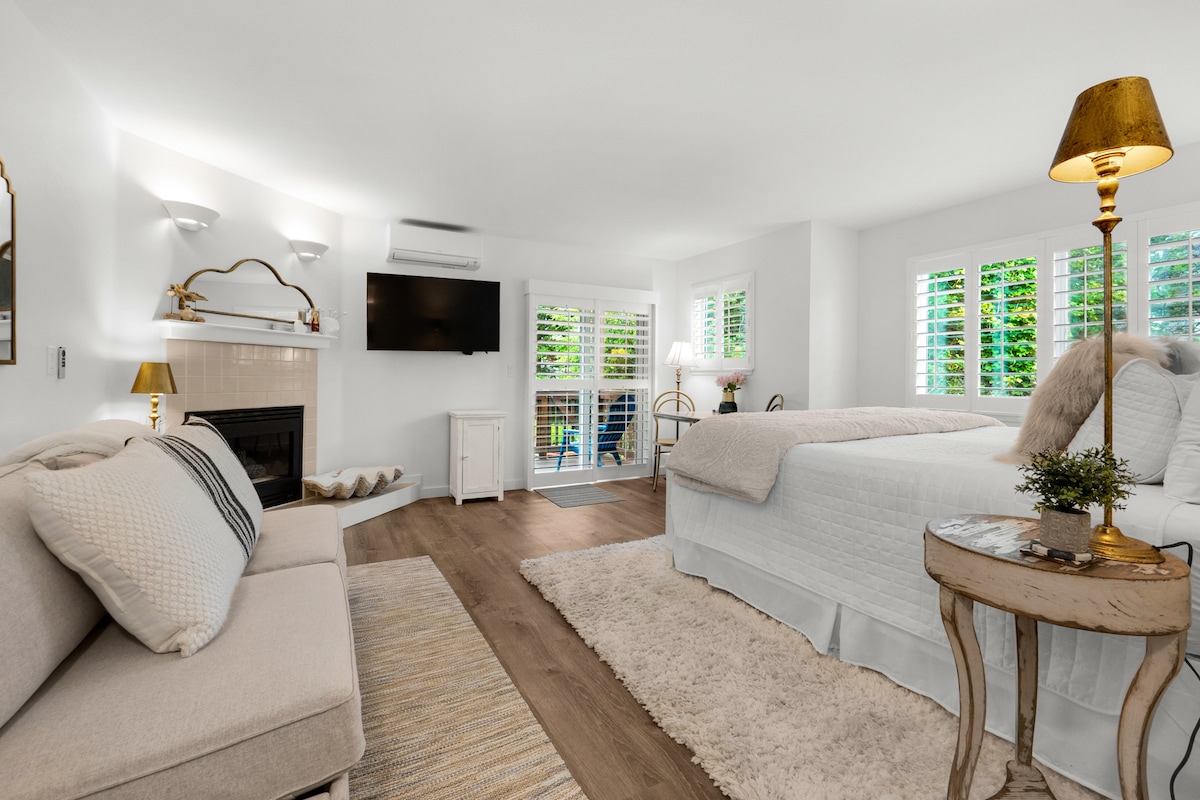 Tahimik na rustic cabin na may 2 Kuwarto (queen bed), 1 paliguan, wood burning fireplace, kusinang kumpleto sa kagamitan, deck, wifi,, ROKU TV. 4 na bloke na lakad papunta sa beach at 2 bloke ng shopping/restaurant. May dalawang paradahan ng kotse sa pribadong driveway, Washer/dryer, bedding, at mga tuwalya. Malugod na tinatanggap ang mga alagang hayop at ganap na nababakuran ang bakuran. Hindi na - update ang cabin. Kung naghahanap ka para sa hindi kinakalawang na asero appliances hindi mo mahanap ang mga ito dito, ngunit makakahanap ka ng isang lugar na gusto namin + EV Level 2 charger. Lisensya MCA # 1351