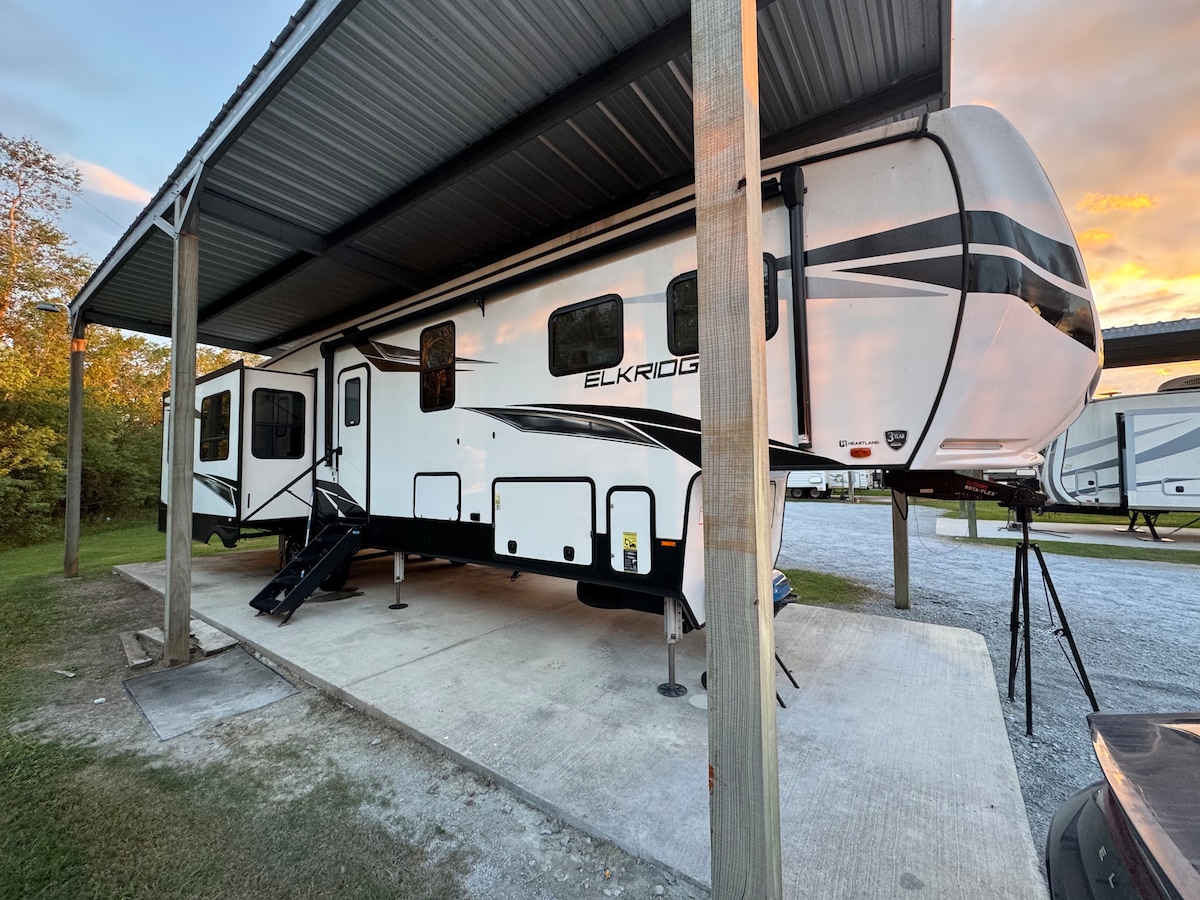 Hindi mo malilimutan ang mapayapang kapaligiran ng rustic na destinasyong ito. Sa isang magiliw na pamilyang Rv park kung saan walang katapusan ang pagrerelaks! Maligayang pagdating sa aming munting tuluyan! Mayroon kaming kumpletong kagamitan at handa nang gamitin, dalawang silid - tulugan isang paliguan Rv! Tatlong bunk bed sa back room at isang reyna sa master! Ang likod na kuwarto ay may couch na natitiklop sa higaan pati na rin ang mesa at couch sa sala! Nilagyan ng fire place para sa iyong mga komportableng gabi, at built - in na ihawan sa labas para sa iyong mga pagtitipon sa hapon.